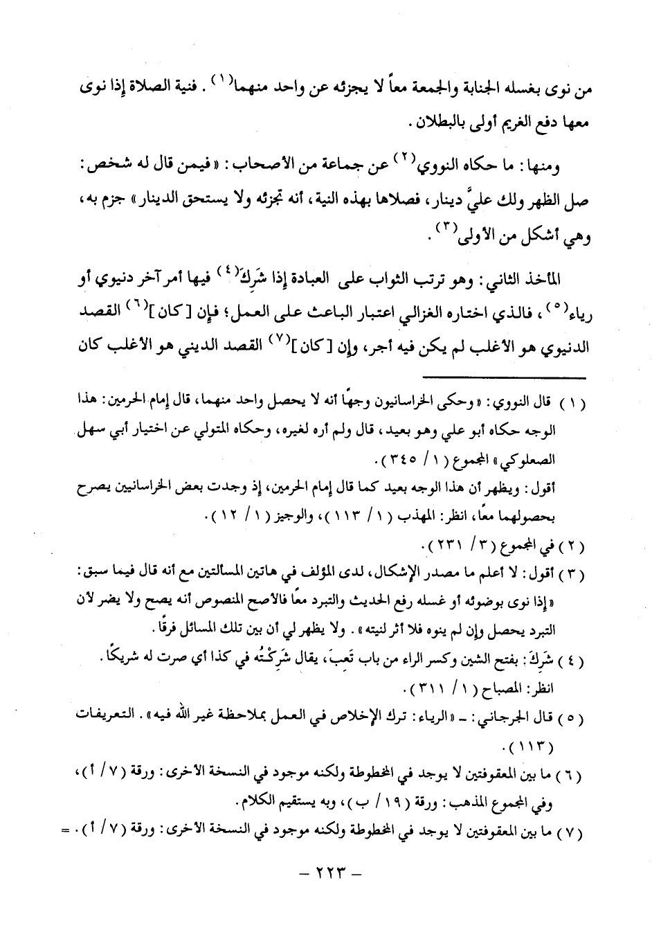 (¬3) أقول: لا أعلم ما مصدر الإِشكال، لدى المؤلف في هاتين المسألتين مع أنه قال فيما سبق: "إِذا نوى بوضوئه أو غسله رفع الحديث والتبرد معًا فالأصح المنصوص أنه يصح ولا يضر لأن التبرد يحصل وإِن لم ينوه فلا أثر لنيته". ولا يظهر لي أن بين تلك المسائل فرقًا.