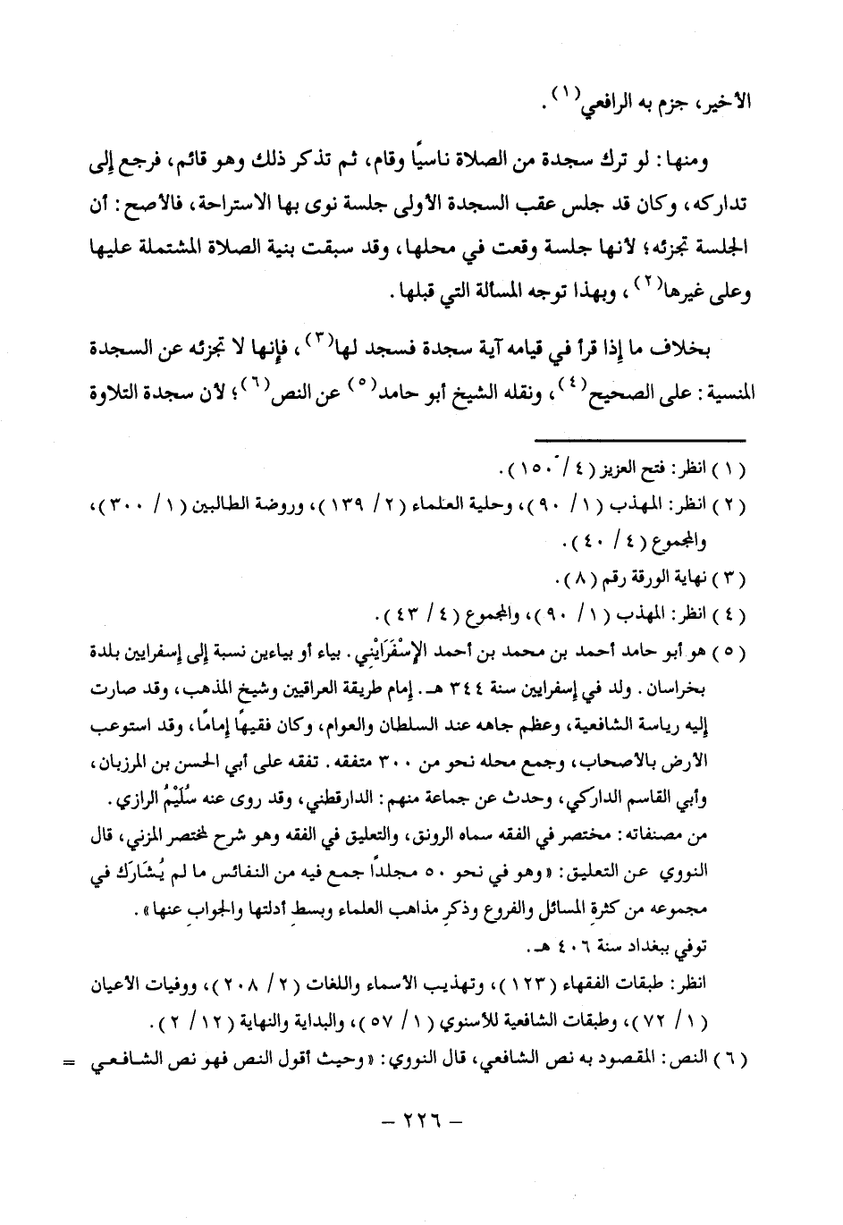 (¬5) هو أبو حامد أحمد بن محمد بن أحمد الإِسْفَرَايْنِي. بياء أو بياءين نسبة إِلى إِسفرايين بلدة بخراسان. ولد في إِسفرايين سنة 344 هـ. إِمام طريقة العراقيين وشيخ المذهب، وقد صارت إِليه رياسة الشافعية، وعظم جاهه عند السلطان والعوام، وكان فقيهًا إِمامًا، وقد استوعب الأرض بالأصحاب، وجمع محله نحو من 300 متفقه. تفقه على أبي الحسن بن المرزبان، وأبي القاسم الدارَكي، وحدث عن جماعة منهم: الدارقطني، وقد روى عنه سُلَيْمُ الرازي.