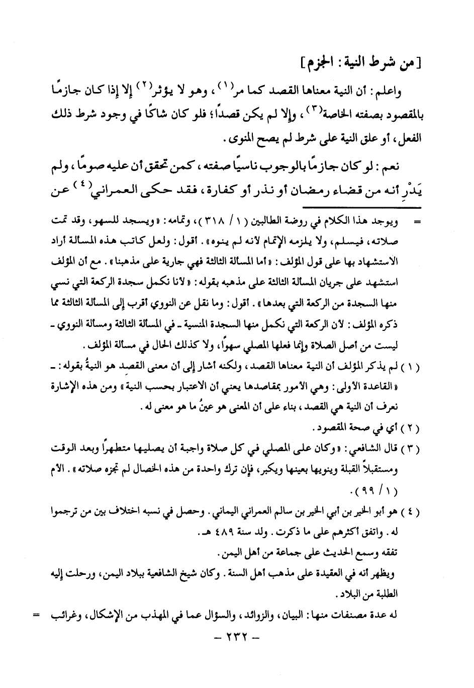 واعلم: أن النية معناها القصد كما مر (¬1)، وهو لا يؤثر (¬2) إِلا إِذا كان جازمًا بالمقصود بصفته الخاصة (¬3)، وإِلا لم يكن قصدًا؛ فلو كان شاكًا في وجود شرط ذلك الفعل، أو علق النية على شرط لم يصح المنوى.