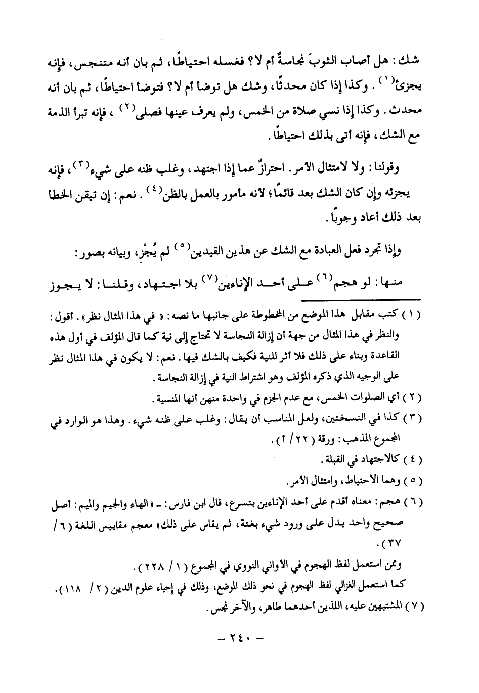 (¬1) كتب مقابل هذا الموضع من المخطوطة على جانبها ما نصه: "في هذا المثال نظر". أقول: والنظر في هذا المثال من جهة أن إِزالة النجاسة لا تحتاج إِلى نية كما قال المؤلف في أول هذه القاعدة وبناء على ذلك فلا أثر للنية فكيف بالشك فيها. نعم: لا يكون في هذا المثال نظر على الوجيه الذي ذكره المؤلف وهو اشتراط النية في إزالة النجاسة.