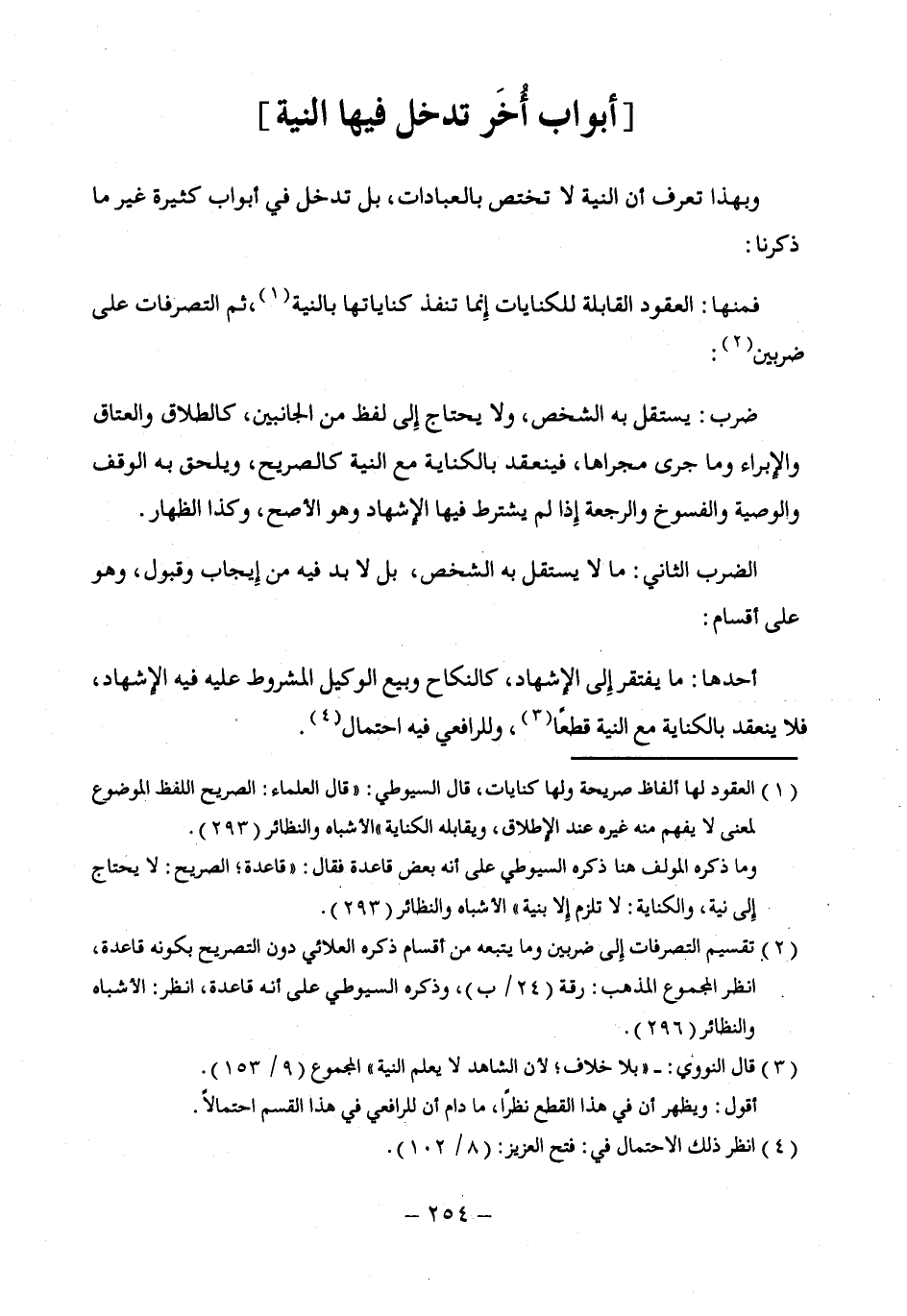 ضرب: يستقل به الشخص، ولا يحتاج إِلى لفظ من الجانبين، كالطلاق والعتاق والإبراء وما جرى مجراها، فينعقد بالكناية مع النية كالصريح، ويلحق به الوقف والوصية والفسوخ والرجعة إِذا لم يشترط فيها الإشهاد وهو الأصح، وكذا الظهار.
