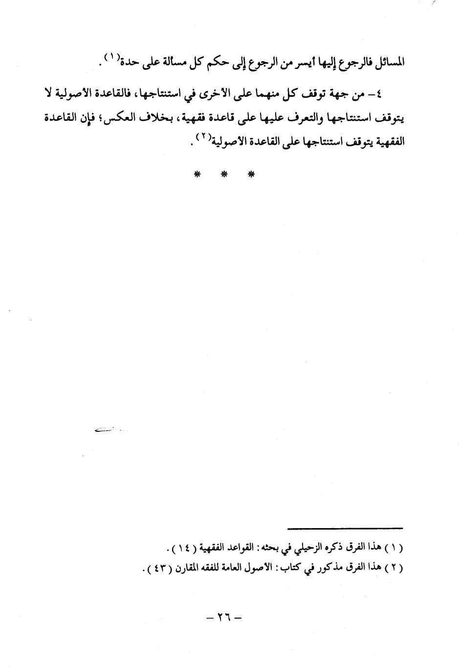 4 - من جهة توقف كل منهما على الأخرى في استنتاجها، فالقاعدة الأصولية لا يتوقف استنتاجها والتعرف عليها على قاعدة فقهية، بخلاف العكس، فإن القاعدة الفقهية يتوقف استنتاجها على القاعدة الأصولية (¬2).