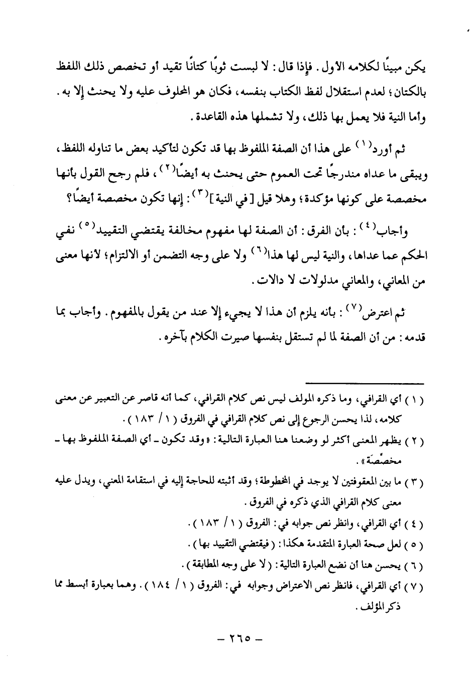 (¬7) أي القرافي، فانظر نص الاعتراض وجوابه في: الفروق (1/ 184). وهما بعبارة أبسط مما ذكر المؤلف.