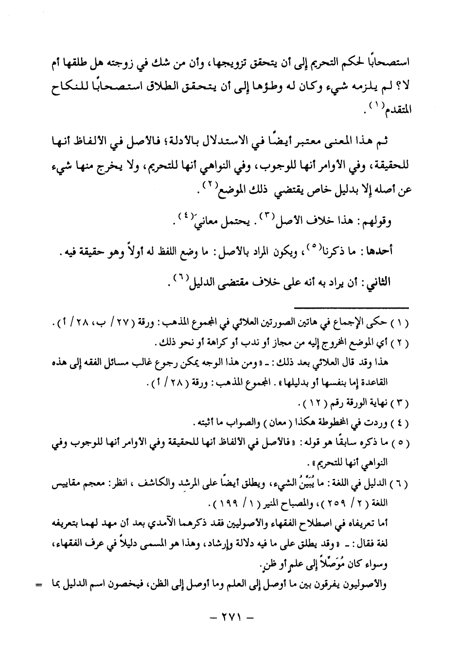 (¬5) ما ذكره سابقًا هو قوله: "فالأصل في الألفاظ أنها للحقيقة وفي الأوامر أنها للوجوب وفي النواهي أنها للتحريم".