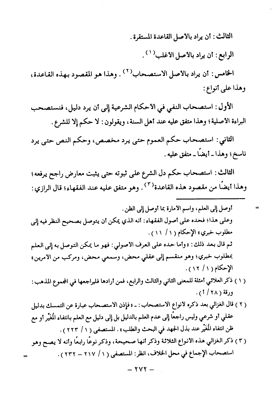 (¬2) قال الغزالي بعد ذكره لأنواع الاستصحاب: - "فإذن الاستصحاب عبارة عن التمسك بدليل عقدي أو شرعي وليس راجعًا إلدى عدم العدم بالدليل بل إِلى دليل مع العدم بانتفاء المُغَيِّر أو مع ظن انتفاء المُغَيِّر عند بذل الجهد في البحث والطلب". المستصفى (1/ 223).