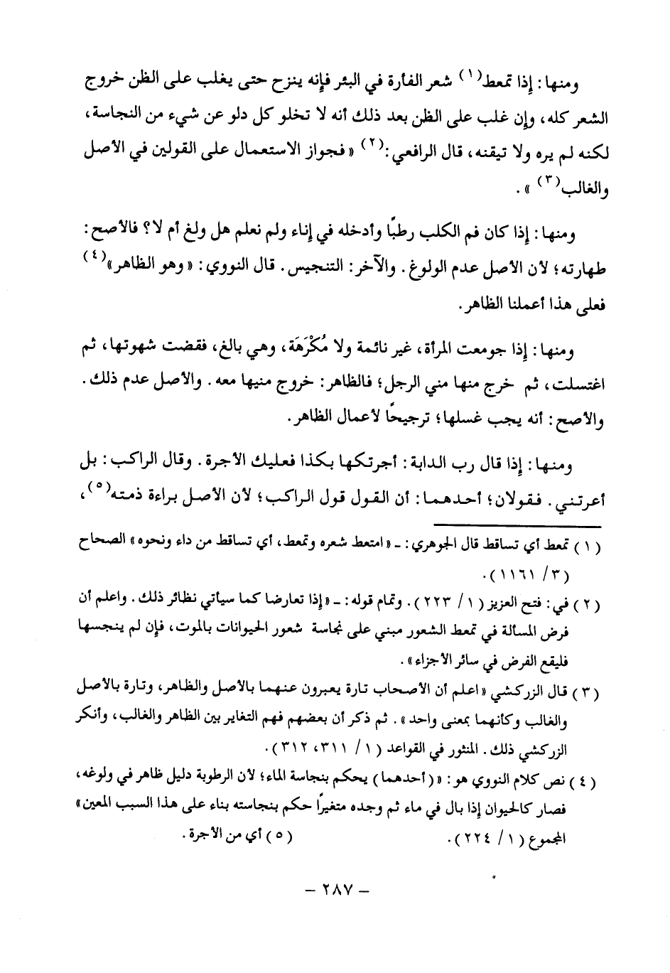 (¬2) في: فتح العزيز (1/ 223). وتمام قوله: - "إِذا تعارضا كما سيأتي نظائر ذلك. واعلم أن فرض المسألة في تمعط الشعور مبني على نجاسة شعور الحيوانات بالموت، فإِن لم ينجسها فليقع الفرض في سائر الأجزاء".