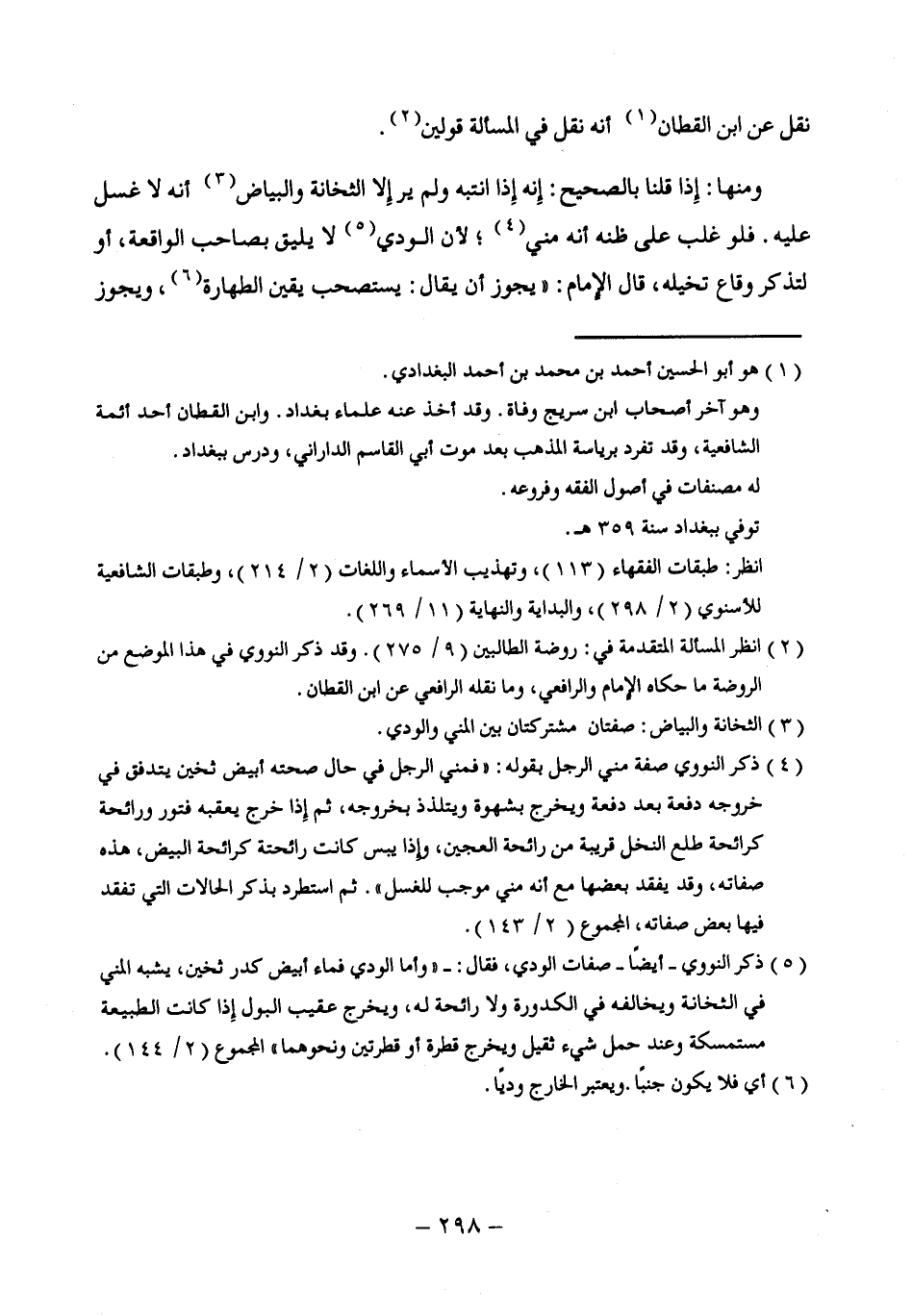 (¬4) ذكر النووي صفة مني الرجل كقوله: "فمني الرجل في حال صحته أبيض ثخين يتدفق في خروجه دفعة بعد دفعة ويخرج بشهوة ويتلذذ بخروجه، ثم إِذا خرج يعقبه فتور ورائحة كرائحة طلع النخل قريبة من رائحة العجين، وإذا يبس كانت رائحتة كرائحة البيض، هذه صفاته، وقد يفقد بعضها مع أنه مني موجب للغسل". ثم استطرد بذكر الحالات التي تفقد فيها بعض صفاته، المجموع (2/ 143).