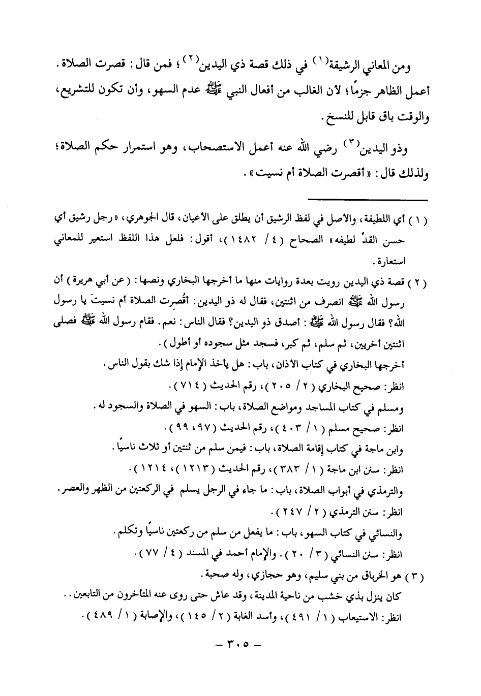 (¬2) قصة ذي اليدين رويت بعدة روايات منها ما أخرجها البخارى ونصها: (عن أبي هريرة) أن رسول الله - صلى الله عليه وسلم - انصرف من اثنتين، فقال له ذو اليدين: أقُصِرت الصلاة أم نسيتَ يا رسول الله؟ فقال رسول الله - صلى الله عليه وسلم -: أصدق ذو اليدين؟ فقال الناس: نعم. فقام رسول الله - صلى الله عليه وسلم - فصلى اثنتين أخريين، ثم سلم، ثم كبر، فسجد مثل سجوده أو أطول).