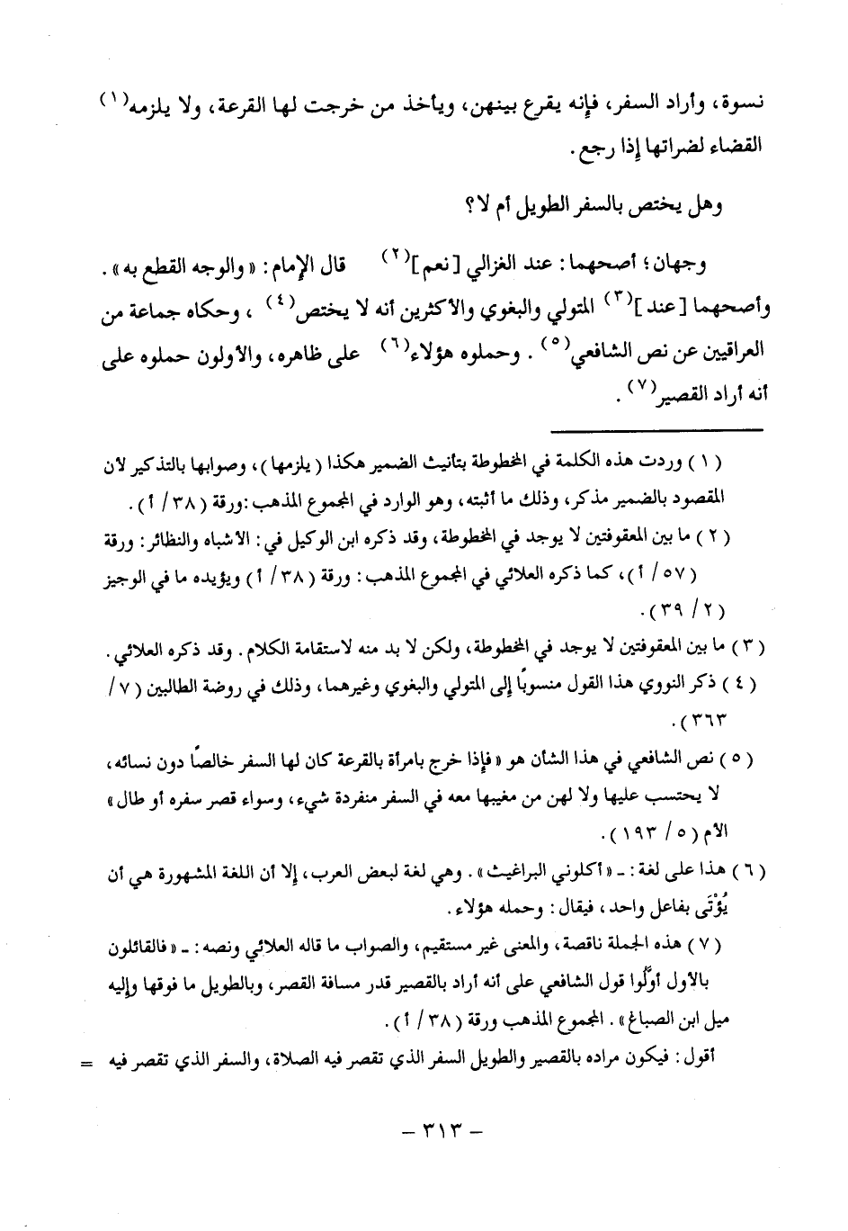 (¬5) نص الشافعي في هذا الشأن هو "فإذا خرج بامرأة بالقرعة كان لها السفر خالصًا دون نسائه، لا يحتسب عليها ولا لهن من مغيبها معه في السفر منفردة شيء، وسواء قصر سفره أو طال" الأم (5/ 193).