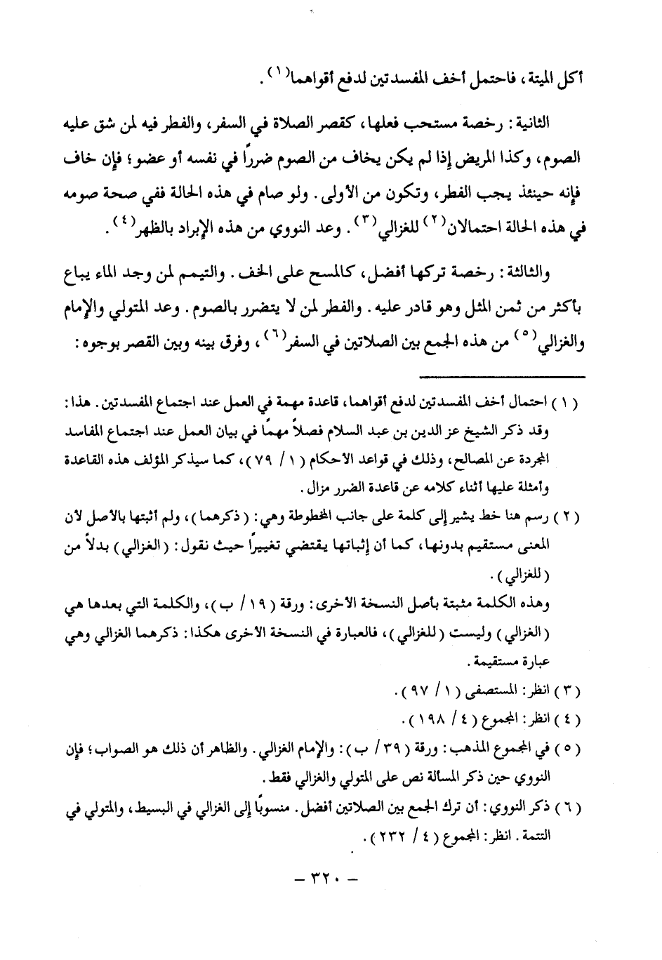 (¬1) احتمال أخف المفسدتين لدفع أقواهما، قاعدة مهمة في العمل عند اجتماع المفسدتين. هذا: وقد ذكر الشيخ عز الدين بن عبد السلام فصلًا مهمًا في بيان العمل عند اجتماع المفاسد المجردة عن المصالح، وذلك في قواعد الأحكام (1/ 79)، كما سيذكر المؤلف هذه القاعدة وأمثلة عليها أثناء كلامه عن قاعدة الضرر مزال.