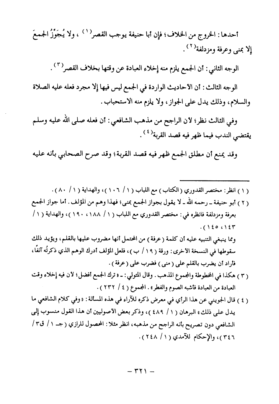 (¬2) أبو حنيفة - رحمه الله - لا يقول بجواز الجمع بمنى، فهذا وهم من المؤلف. أما جواز الجمع بعرفة ومزدلفة فانظره في: مختصر القدورى مع اللباب (1/ 188، 190)، والهداية (1/ 143، 145).