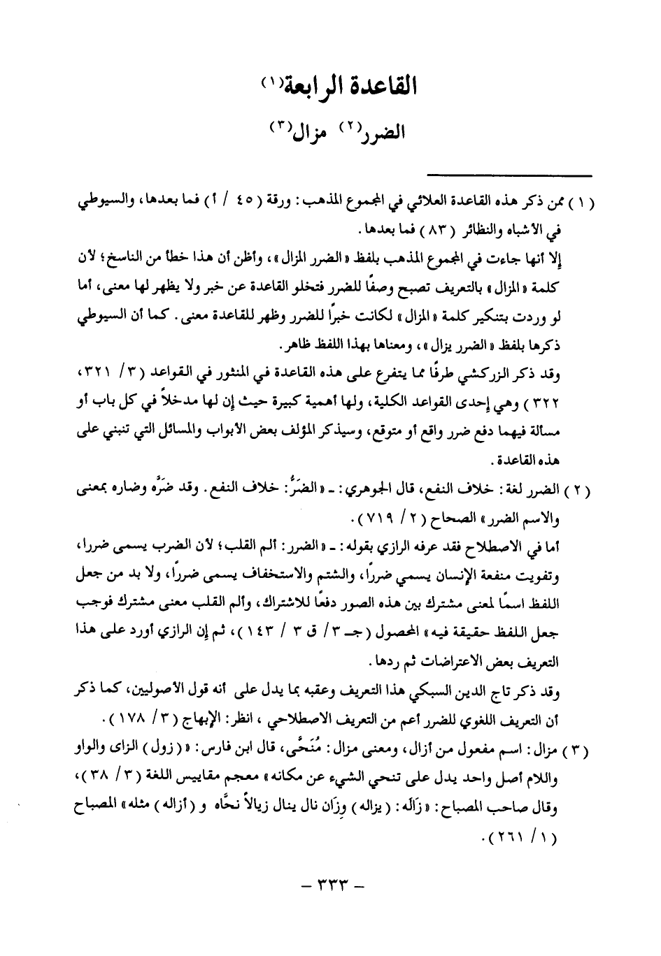 إِلا أنها جاءت في المجموع المذهب بلفظ "الضرر المزال"، وأظن أن هذا خطأ من الناسخ؛ لأن كلمة "المزال" بالتعريف تصبح وصفًا للضرر فتخلو القاعدة عن خبر ولا يظهر لها معنى، أما لو وردت بتنكير كلمة "المزال" لكانت خبرًا للضرر وظهر للقاعدة معنى. كما أن السيوطي ذكرها بلفظ "الضرر يزال"، ومعناها بهذا اللفظ ظاهر.