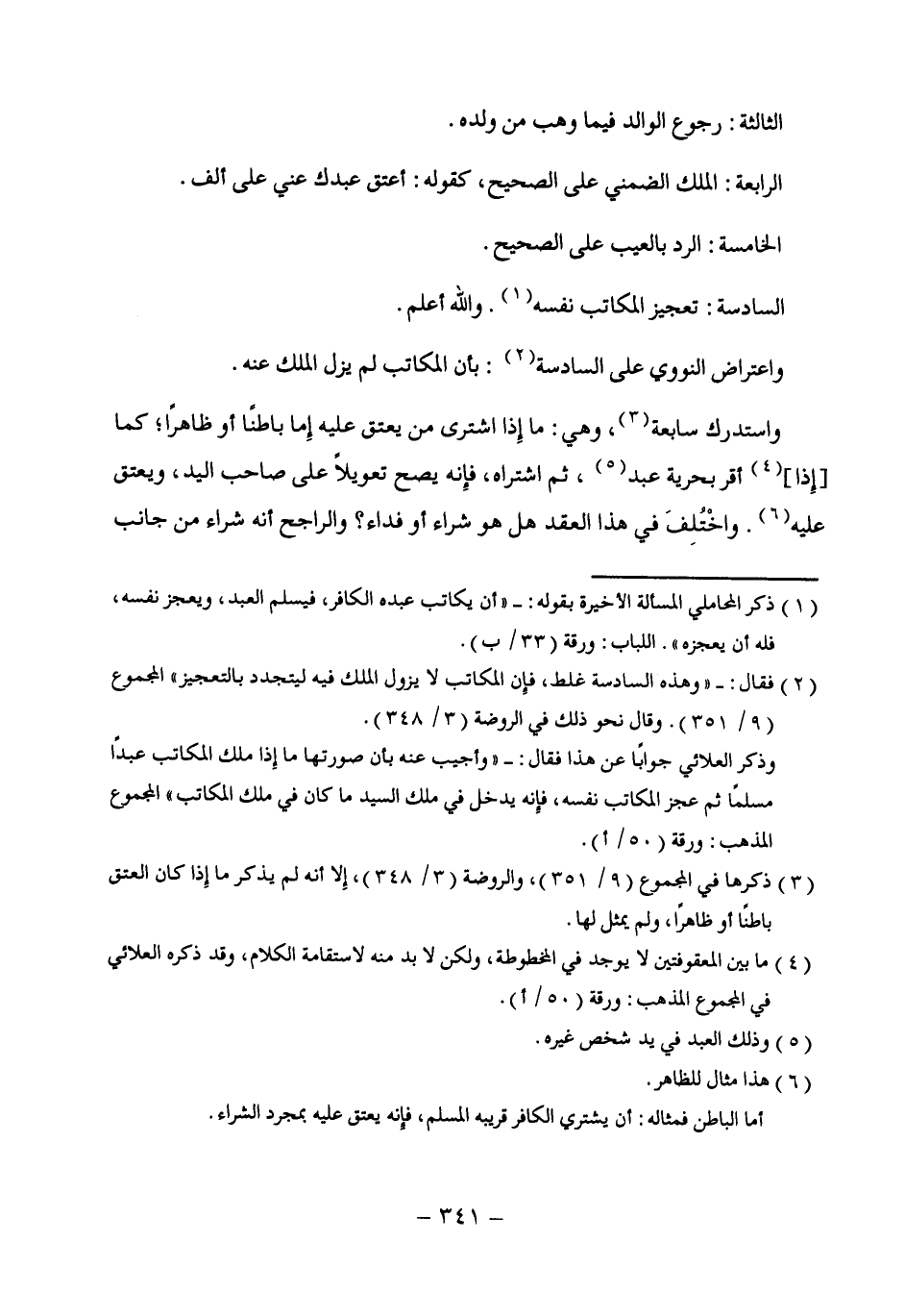 (¬2) فقال: - "وهذه السادسة غلط، فإِن المكاتب لا يزول الملك فيه ليتجدد بالتعجيز" المجموع (9/ 351). وقال نحو ذلك في الروضة (3/ 348).