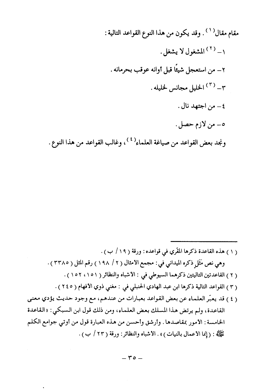 (¬4) قد يعبّر العلماء عن بعض القواعد بعبارات من عندهم، مع وجود حديث يؤدي معنى القاعدة، ولم يرتض هذا المسلك بعض العلماء، ومن ذلك قول ابن السبكي: "القاعدة الخامسة: الأمور بمقاصدها. وأرشق وأحسن من هذه العبارة قول من أوتي جوامع الكلم -صلى الله عليه وسلم -: (إنما الأعمال بالنيات) ". الأشباه والنظائر: ورقة (23 / ب).