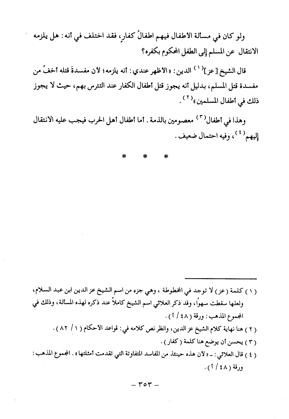 (¬1) كلمة (عز) لا توجد في المخطوطة، وهي جزء من اسم الشيخ عز الدين ابن عبد السلام، ولعلها سقطت سهوًا، وقد ذكر العلائي اسم الشيخ كاملًا عند ذكره لهذه المسألة، وذلك في المجموع المذهب: ورقة (48 / أ).