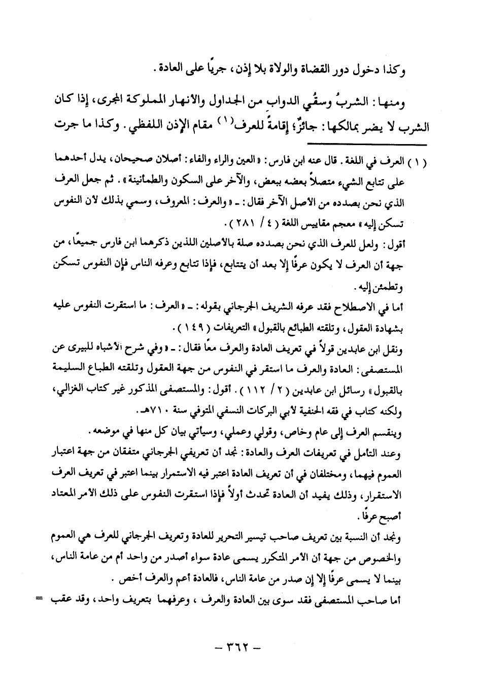 (¬1) العرف في اللغة. قال عنه ابن فارس: "العين والراء والفاء: أصلان صحيحان، يدل أحدهما على تتابع الشيء متصلًا بعضه ببعض، والآخر على السكون والطمأنينة". ثم جعل العرف الذي نحن بصدده من الأصل الآخر فقال: - "والعرف: المعروف، وسمي بذلك لأن النفوس تسكن إِليه" معجم مقاييس اللغة (4/ 281).