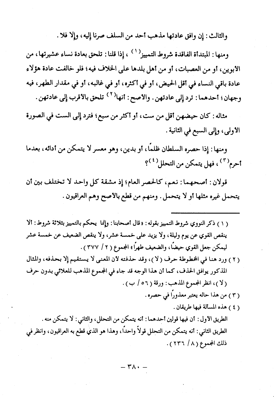 (¬2) ورد هنا في المخطوطة حرف (لا)، وقد حذفته لأن المعنى لا يستقيم إِلا بحذفه، والمثال المذكور يوافق الحذف، كما أن هذا الوجه قد جاء في المجموع المذهب للعلائي بدون حرف (لا)، انظر المجموع الذهب: ورقة (56/ ب).
