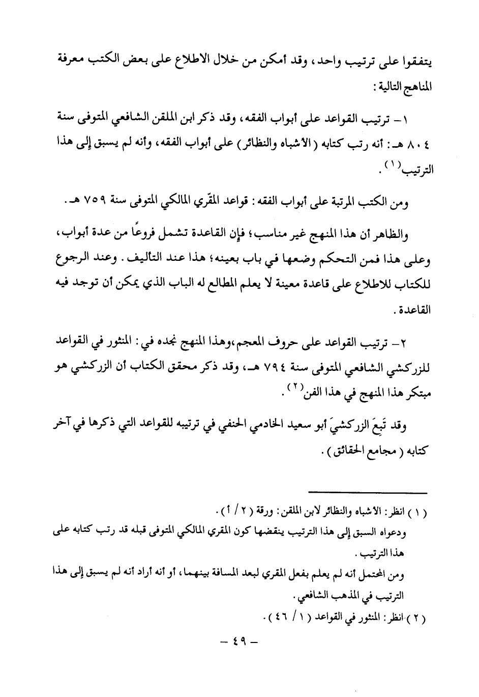 2 - ترتيب القواعد على حروف المعجم، وهذا المنهج نجده في: المنثور في القواعد للزركشي الشافعي المتوفى سنة 794 هـ، وقد ذكر محقق الكتاب أن الزركشي هو مبتكر هذا المنهج في هذا الفن (¬2).