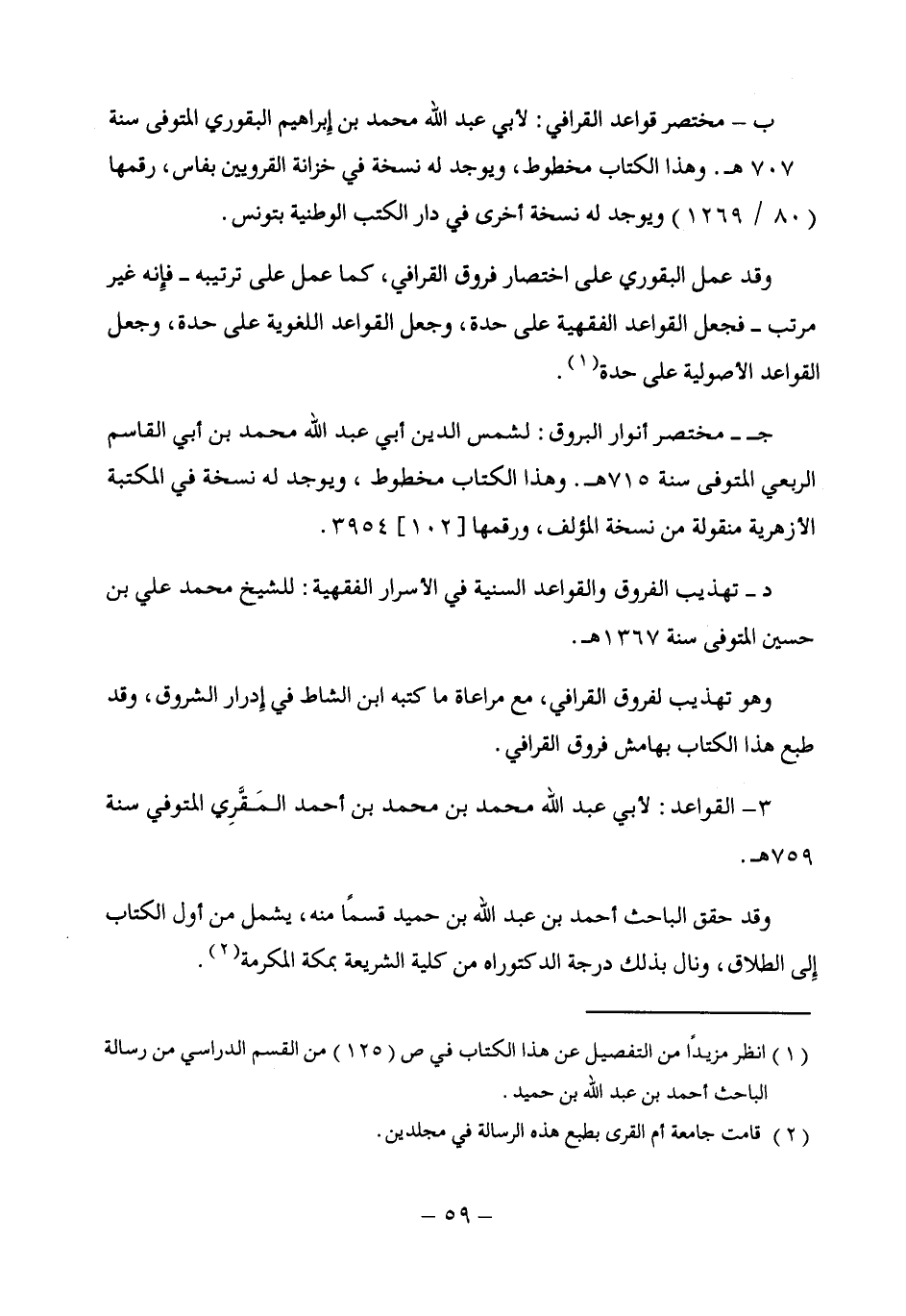 ب - مختصر قواعد القرافي: لأبي عبد الله محمد بن إِبراهيم البقورى المتوفى سنة 707 هـ. وهذا الكتاب مخطوط، ويوجد له نسخة في خزانة القرويين بفاس، رقمها (80/ 1269) ويوجد له نسخة أخرى في دار الكتب الوطنية بتونس.