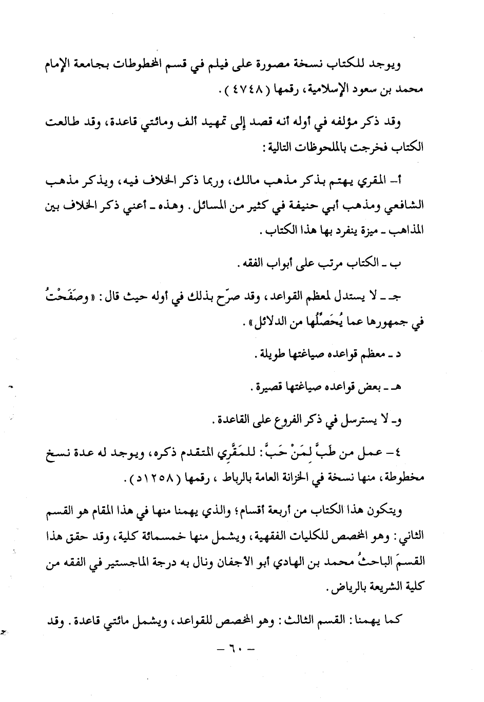 ويتكون هذا الكتاب من أربعة أقسام؛ والذى يهمنا منها في هذا المقام هو القسم الثاني: وهو المخصص للكليات الفقهية، ويشمل منها خمسمائة كلية، وقد حقق هذا القسمَ الباحثُ محمد بن الهادى أبو الأجفان ونال به درجة الماجستير في الفقه من كلية الشريعة بالرياض.