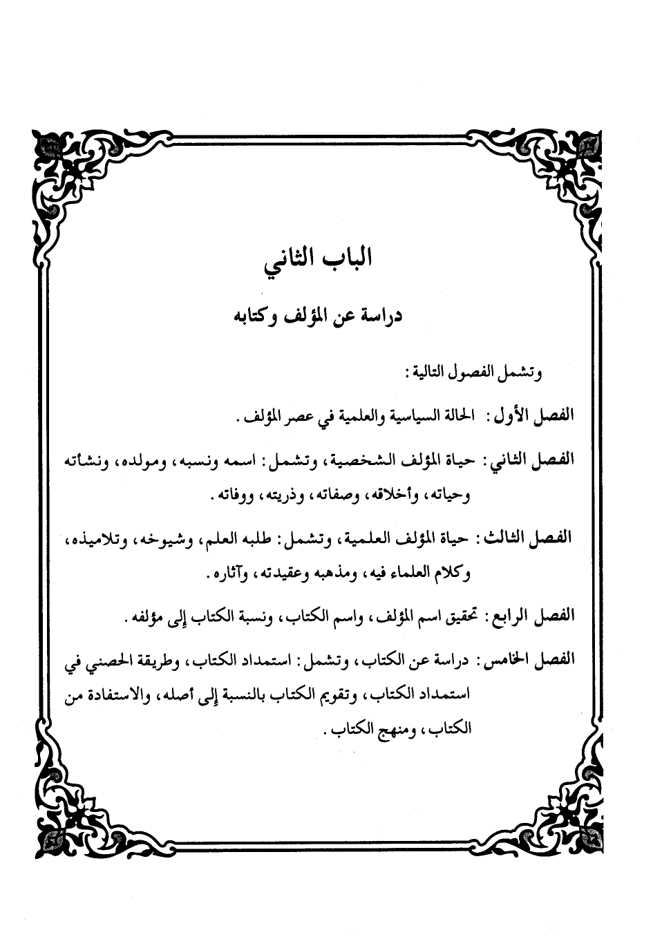 الفصل الثاني: حياة المؤلف الشخصية؛ وتشمل: اسمه ونسبه؛ ومولده، ونشأته وحياته، وأخلاقه، وصفاته، وذريته؛ ووفاته.