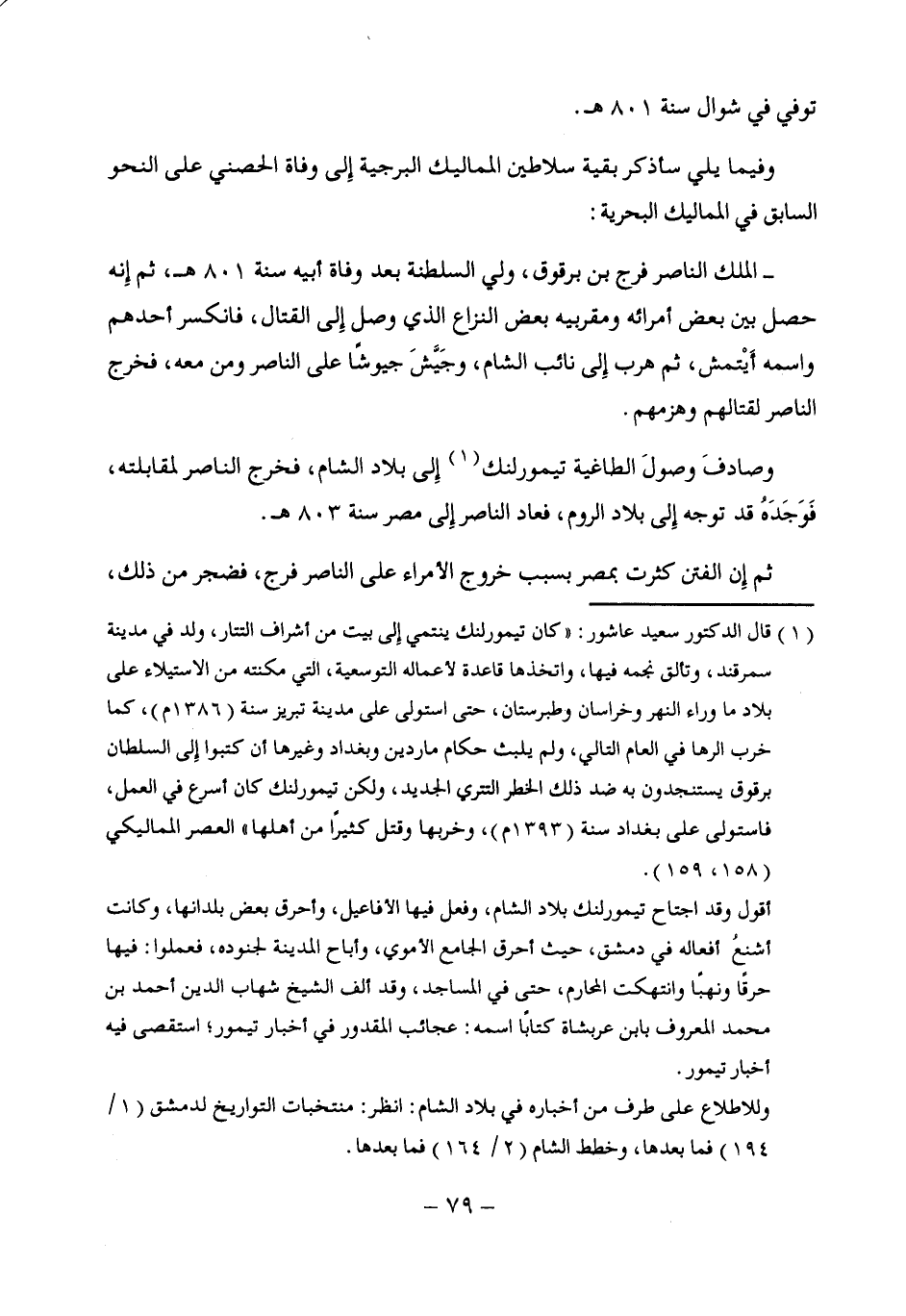 (¬1) قال الدكتور سعيد عاشور: "كان تيمورلنك ينتمي إِلى بيت من أشراف التتار، ولد في مدينة سمرقند؛ وتألق نجمه فيها، واتخذها قاعدة لأعماله التوسعية؛ التي مكنته من الاستيلاء على بلاد ما وراء النهر وخراسان وطبرستان، حتى استولى على مدينة تبريز سنة (1386 م)، كما خرب الرها في العام التالي؛ ولم يلبث حكام ماردين وبغداد وغيرها أن كتبوا إلى السلطان برقوق يستنجدون به ضد ذلك الخطر التترى الجديد؛ ولكن تيمورلنك كان أسرع في العمل، فاستولى على بغداد سنة (1393 م)؛ وخربها وقتل كثيرًا من أهلها" العصر المماليكي (158، 159).