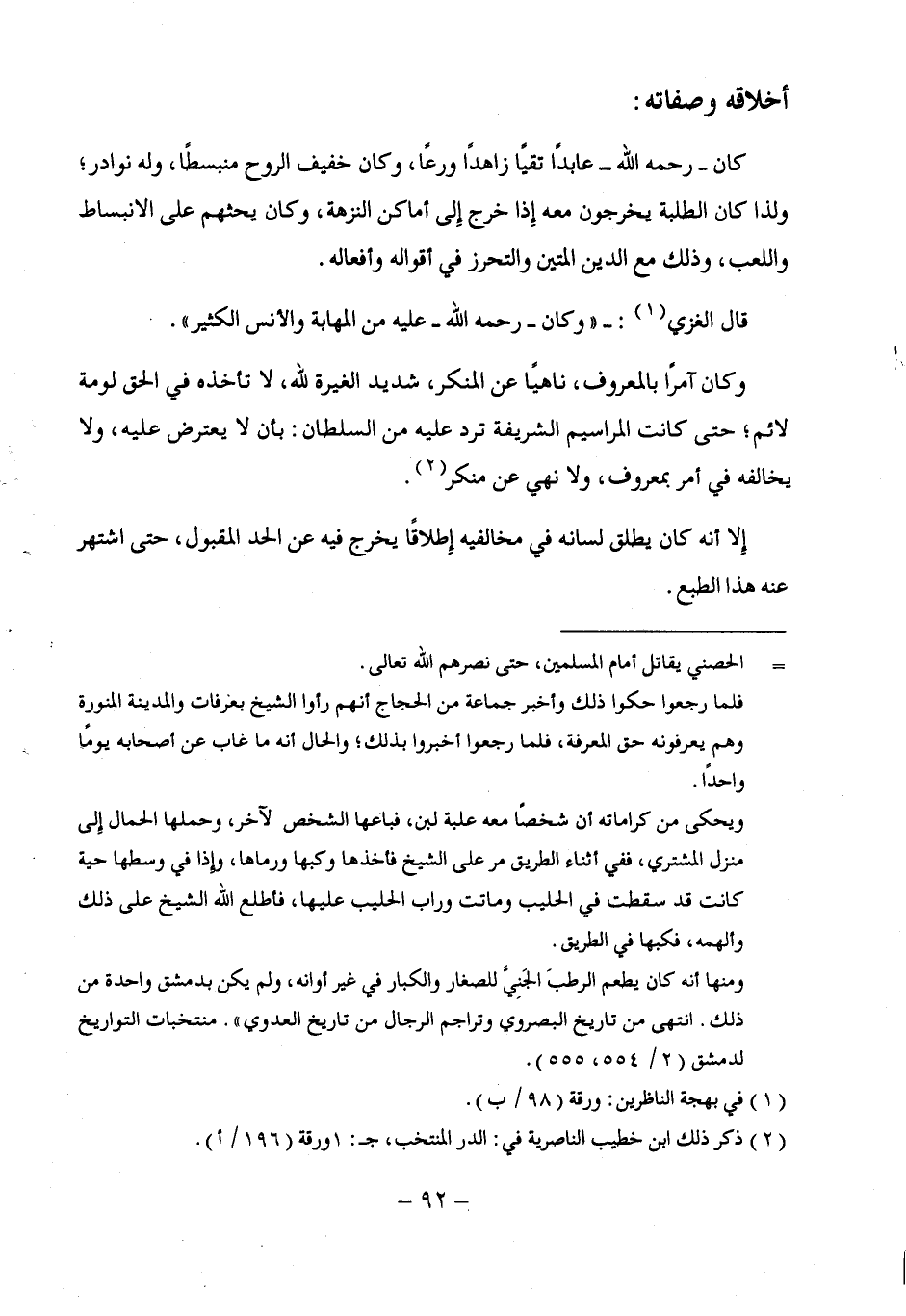 وكان آمرًا بالمعروف؛ ناهيًا عن المنكر؛ شديد الغيرة لله، لا تأخذه في الحق لومة لائم؛ حتى كانت المراسيم الشريفة ترد عليه من السلطان: بأن لا يعترض عليه، ولا يخالفه في أمر بمعروف، ولا نهي عن منكر (¬2).