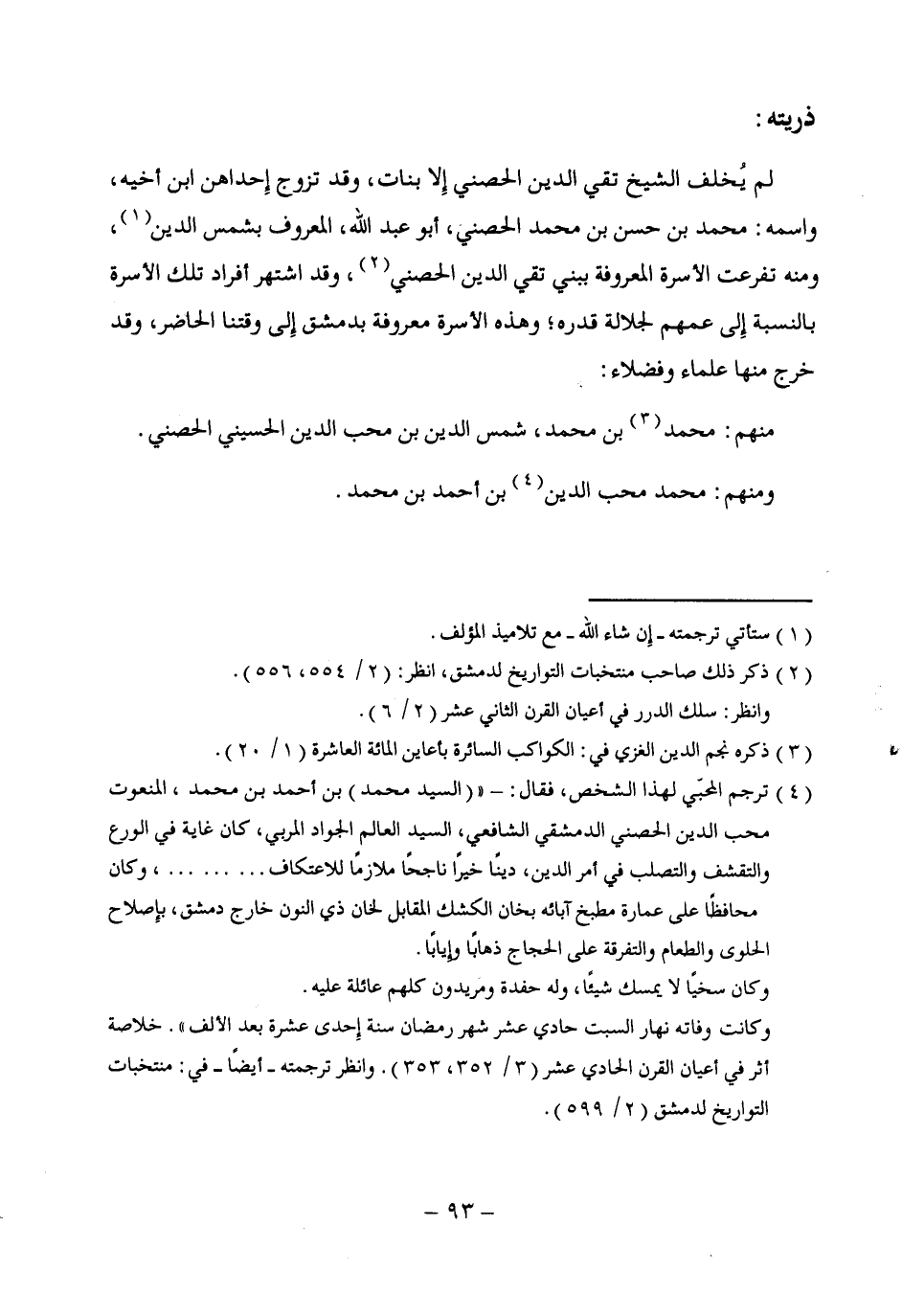 (¬4) ترجم المحبّي لهذا الشخص، فقال: - " (السيد محمد) بن أحمد بن محمد، النعوت محب الدين الحصني الدمشقي الشافعي، السيد العالم الجواد المربي، كان غاية في الورع والتقشف والتصلب في أمر الدين؛ دينًا خيرًا ناجحًا ملازمًا للاعتكاف ... ... ... ، وكان محافظًا على عمارة مطبخ آبائه بخان الكشك المقابل لخان ذي النون خارج دمشق؛ بإصلاح الحلوى والطعام والتفرقة على الحجاج ذهابًا وإيابًا.