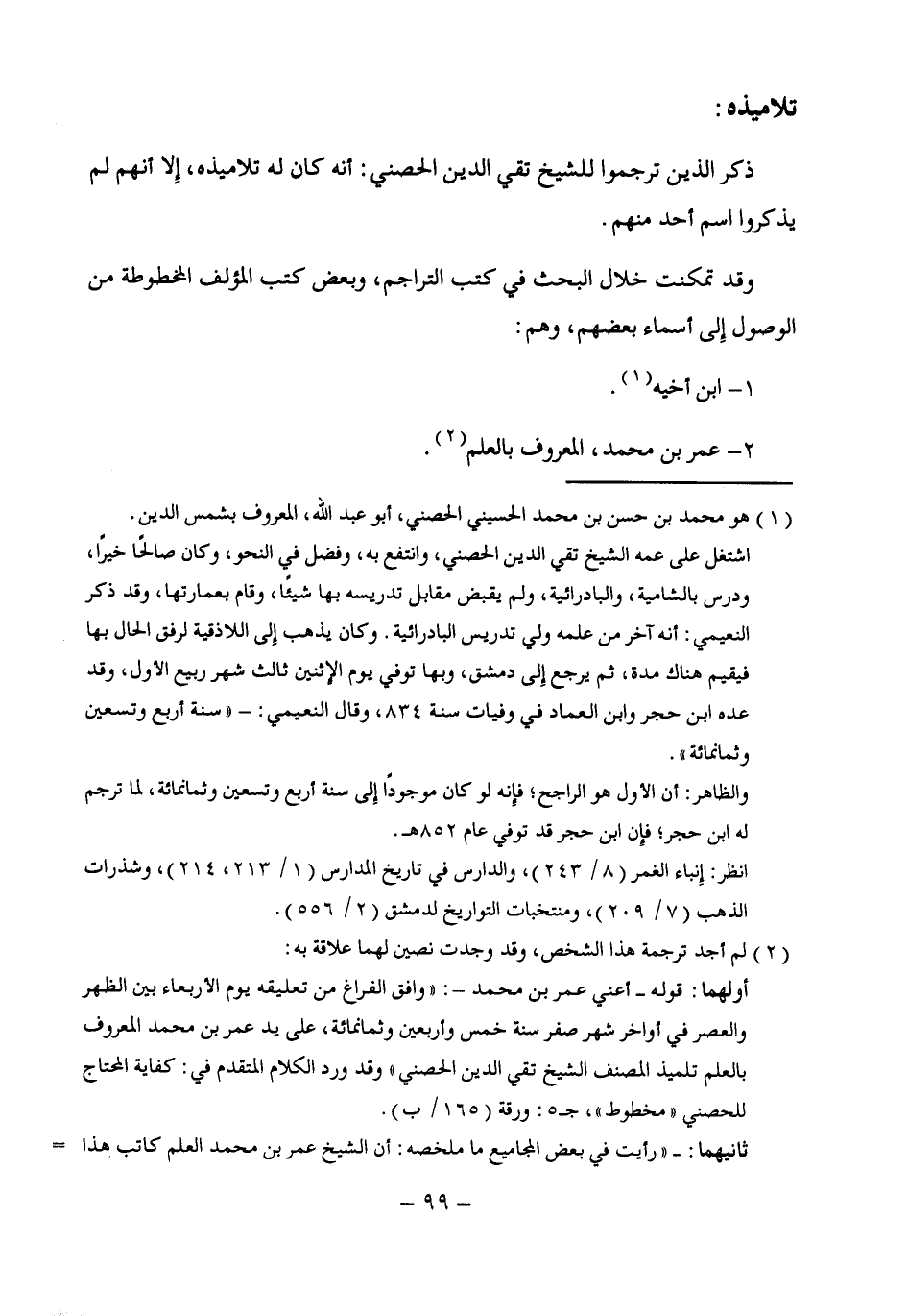 (¬2) لم أجد ترجمة هذا الشخص، وقد وجدت نصين لهما علاقة به: أولهما: قوله -أعني عمر بن محمد-: "وافق الفراغ من تعليقه يوم الأربعاء بين الظهر والعصر في أواخر شهر صفر سنة خمس وأربعين وثمانمائة، على يد عمر بن محمد المعروف بالعلم تلميذ المصنف الشيخ تقي الدين الحصني" وقد ورد الكلام المتقدم في: كفاية المحتاج للحصني "مخطوط"، جـ 5: ورقة (165 / ب).