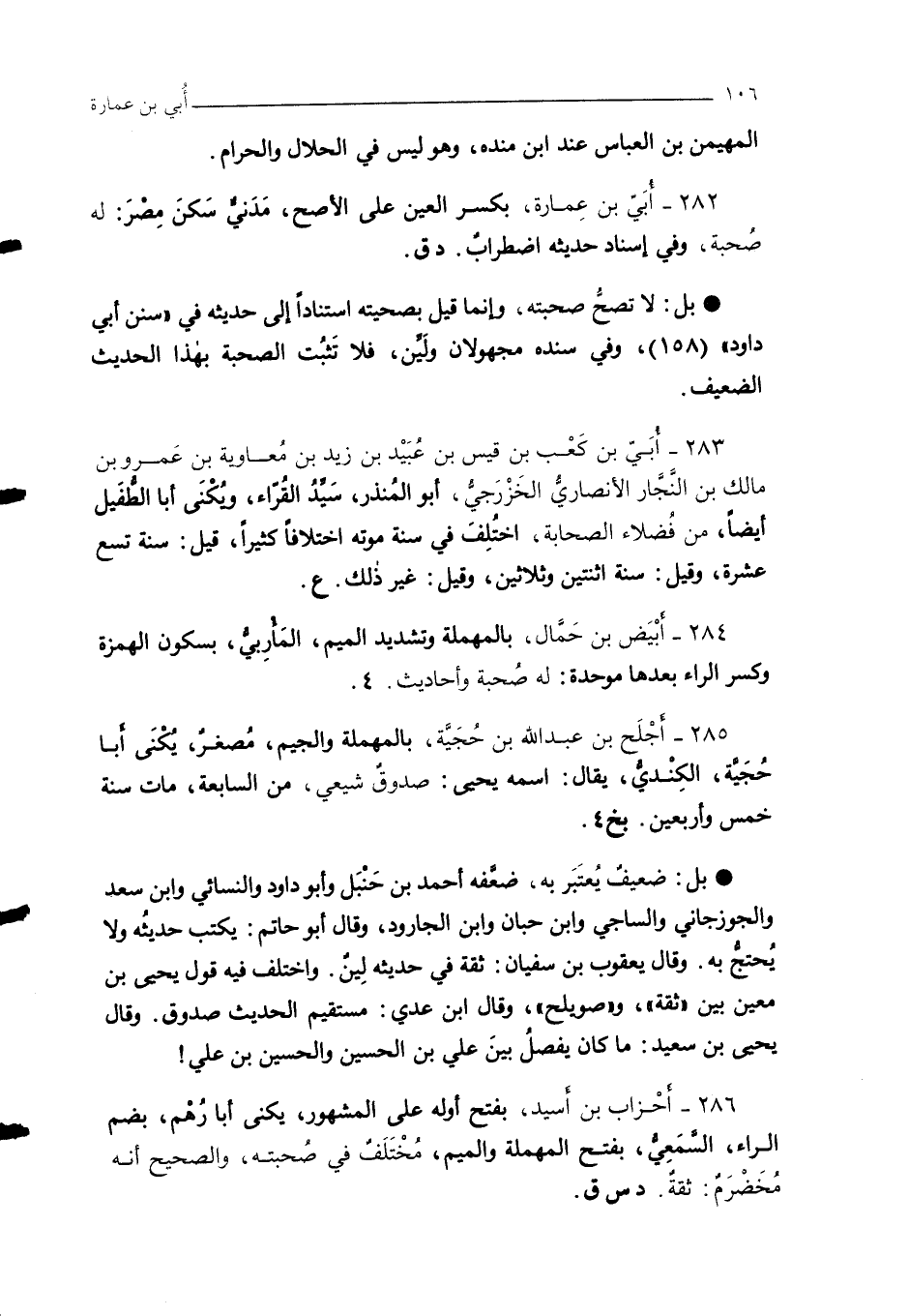 282 - أُبَيّ بن عِمارة، بكسر العين على الأصح، مَدَنيٌّ سَكَنَ مِصْرَ: له صُحبة، وفي إسناد حديثه اضطرابٌ. د ق.