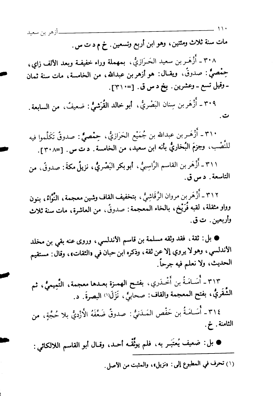 308 - أزْهَر بن سعيد الحَرَازيُّ، بمهملة وراء خفيفة وبعد الألف زاي، حِمْصيٌّ: صدوق، ويقال: هو أزهر بن عبد الله، من الخامسة، مات سنة ثمان - وقيل تسع - وعشرين. بخ د س ق. [= 310].