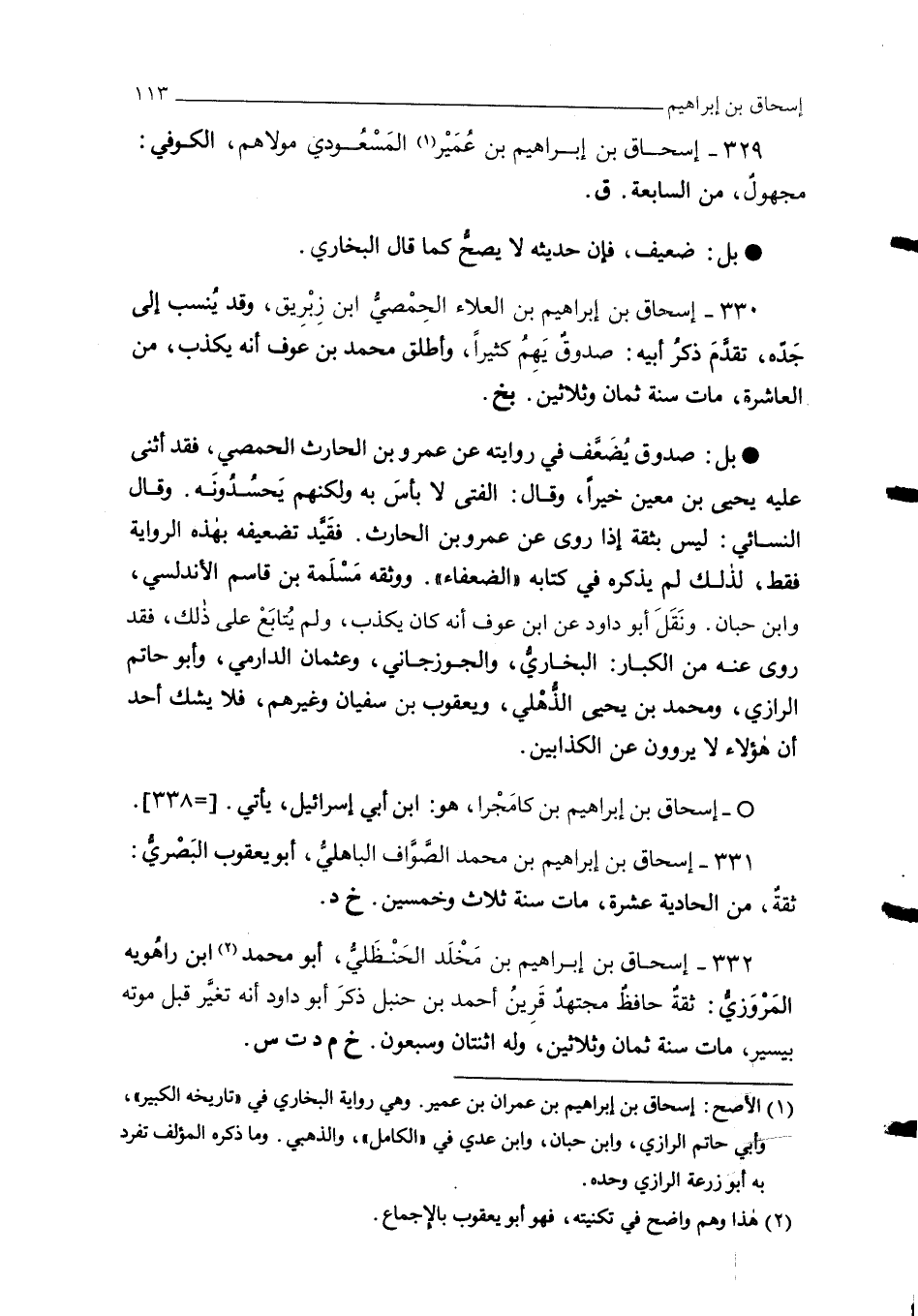 330 - إسحاق بن إبراهيم بن العلاء الحِمْصيُّ ابن زِبْرِيق، وقد يُنسب إلى جَدِّه، تقدَّم ذكر أبيه: صدوقٌ يَهِمُ كثيرًا، وأطلق محمد بن عوف أنه يكذب، من العاشرة، مات سنة ثمان وثلاثين. بخ.