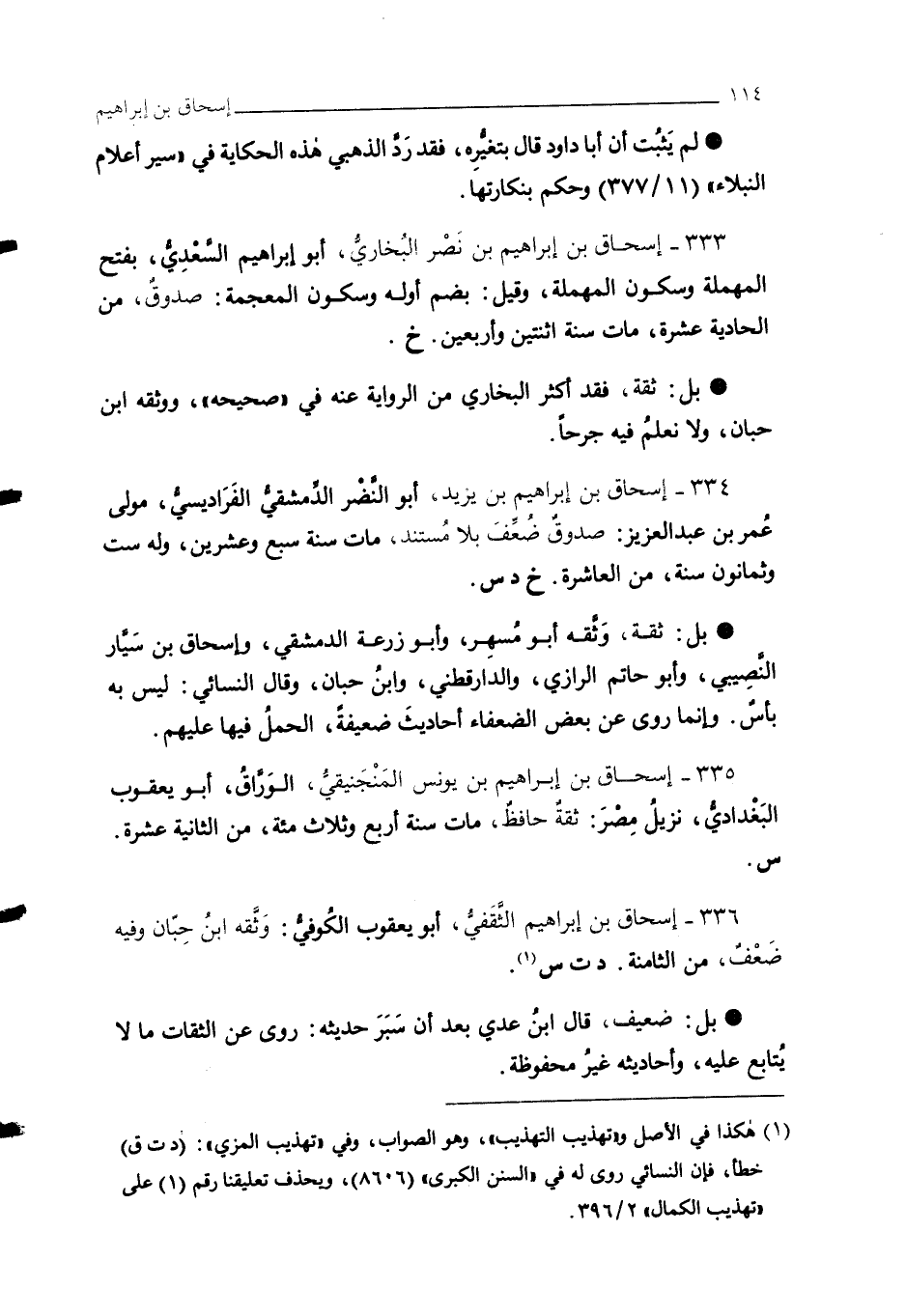 335 - إسحاق بن إبراهيم بن يونس المَنْجَنيقيُّ، الوَرَّاقُ، أبو يعقوب البَغْداديُّ، نزيلُ مِصْرَ: ثقةٌ حافظٌ، مات سنة أربع وثلاث مئة، من الثانية عشرة. س.