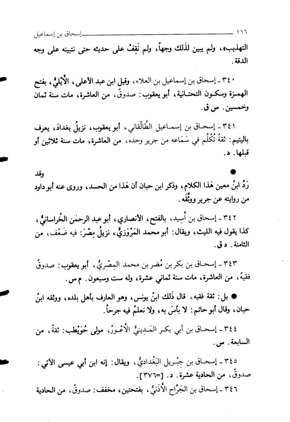 341 - إسحاق بن إسماعيل الطَّالْقاني، أبو يعقوب، نزيلُ بغدادَ، يعرف باليتيم: ثقةٌ تُكُلِّم في سَمَاعه من جرير وحده، من العاشرة، مات سنة ثلاثين أو قبلها. د.