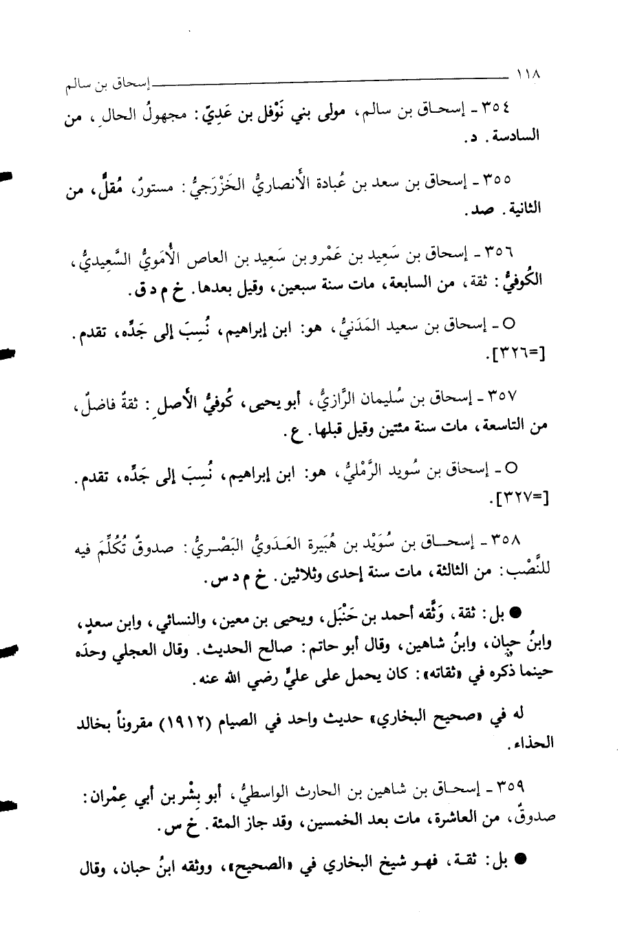 358 - إسحاق بن سُوَيْد بن هُبَيرة العَدَويُّ البَصْريُّ: صدوقٌ تُكُلِّمَ فيه للنَّصْب: من الثالثة، مات سنة إحدى وثلاثين. خم د س.