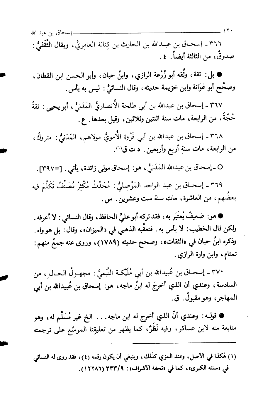 369 - إسحاق بن عبد الواحد المَوْصِليُّ: مُحَدِّثُ مُكْثِرُ مُصَنِّفٌ تَكَلّمَ فيه بعضُهم، من العاشرة، ماتت سنة ست وعشرين. س.