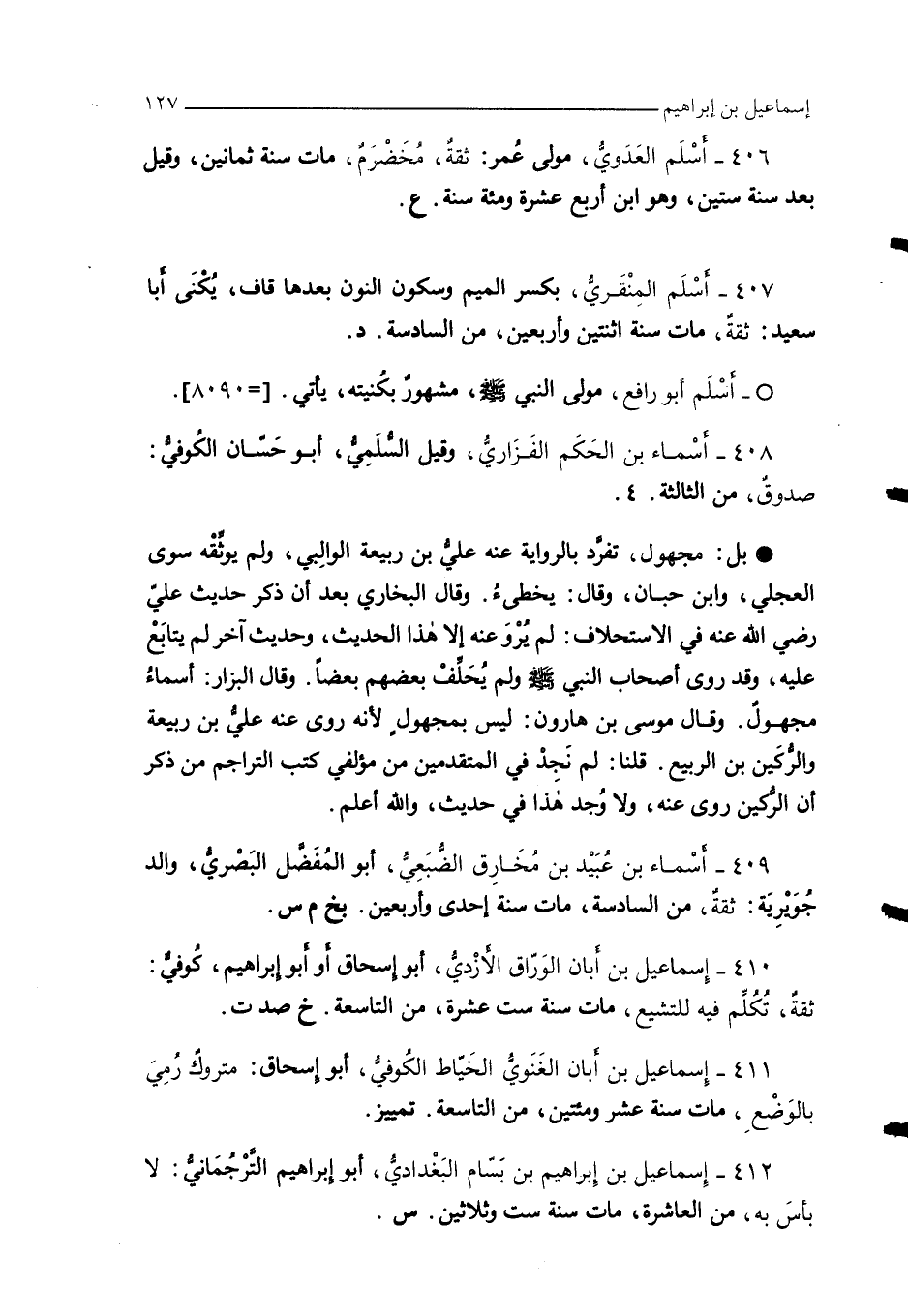 408 - أسْماء بن الحَكم الفَزَاريُّ، وقيل السُّلَمِيُّ، أبو حَسّان الكُوفيُّ: صدوقٌ، من الثالثة. 4