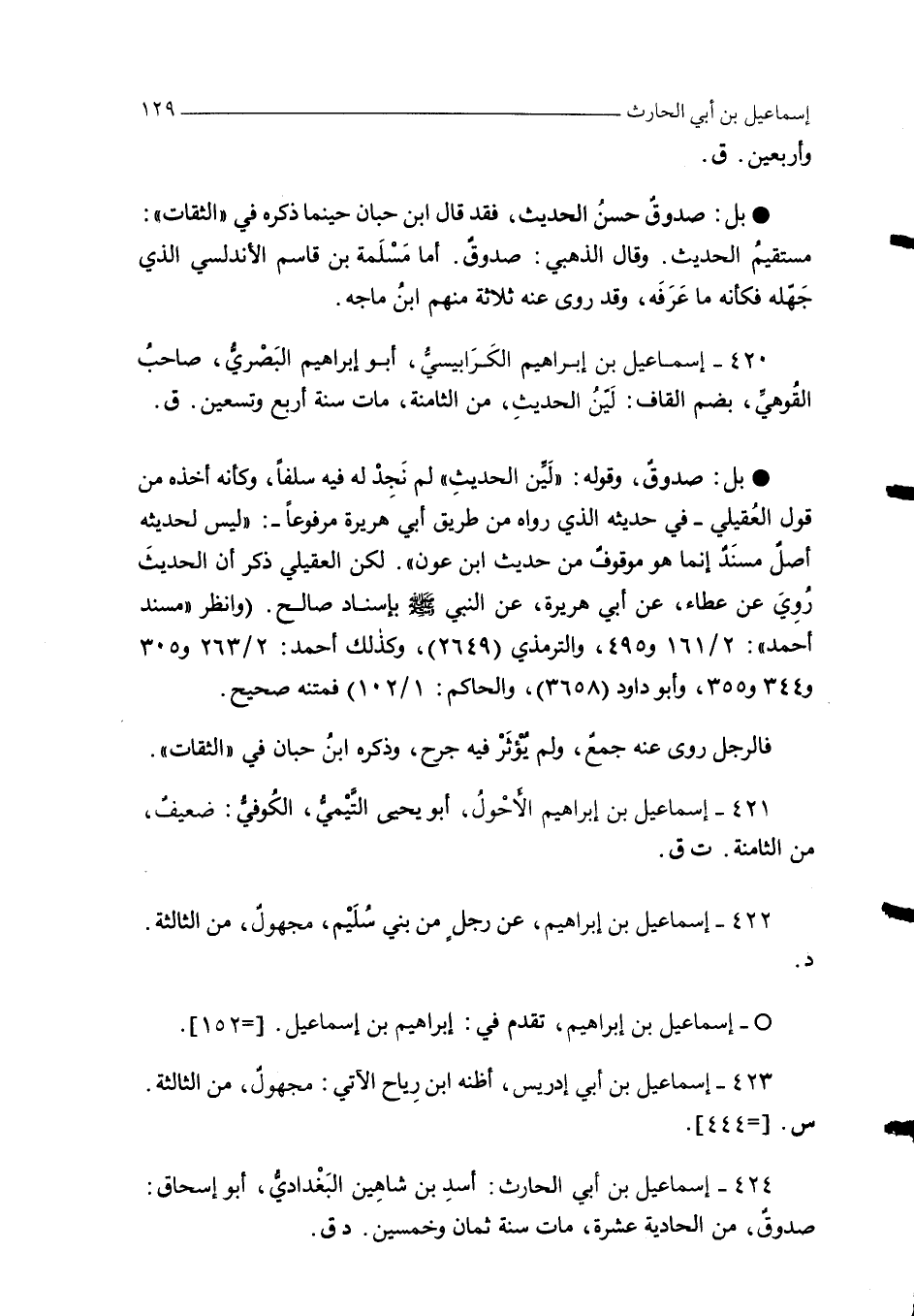 424 - إسماعيل بن أبي الحارث: أسدِ بن شاهِين البَغْداديُّ، أبو إسحاق: صدوقٌ، من الحادية عشرة، مات سنة ثمان وخمسين. د ق.