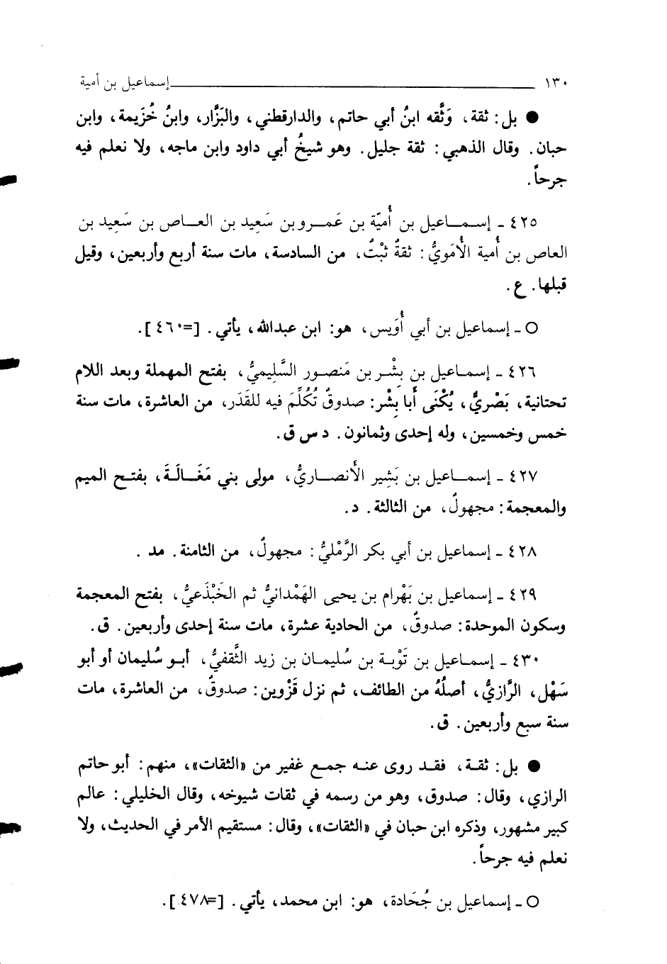 425 - إسماعيل بن أُميّة بن عَمرو بن سَعِيد بن العاص بن سَعيد بن العاص بن أُمية الأمَويُّ: ثقةٌ ثبْتُ، من السادسة، مات سة أربع وأربعين، وقيل قبلها. ع.