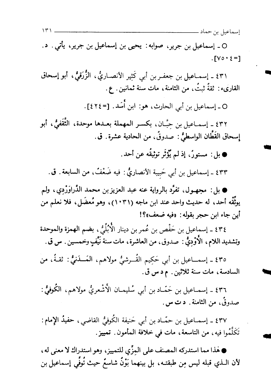 437 - إسماعيل بن حمّاد بن أبي حنيفة الكُوفيُّ القاضي، حفيدُ الإمام: تَكَلَّمُوا فيه، من التاسعة، مات في خلافة المأمون. تمييز.
