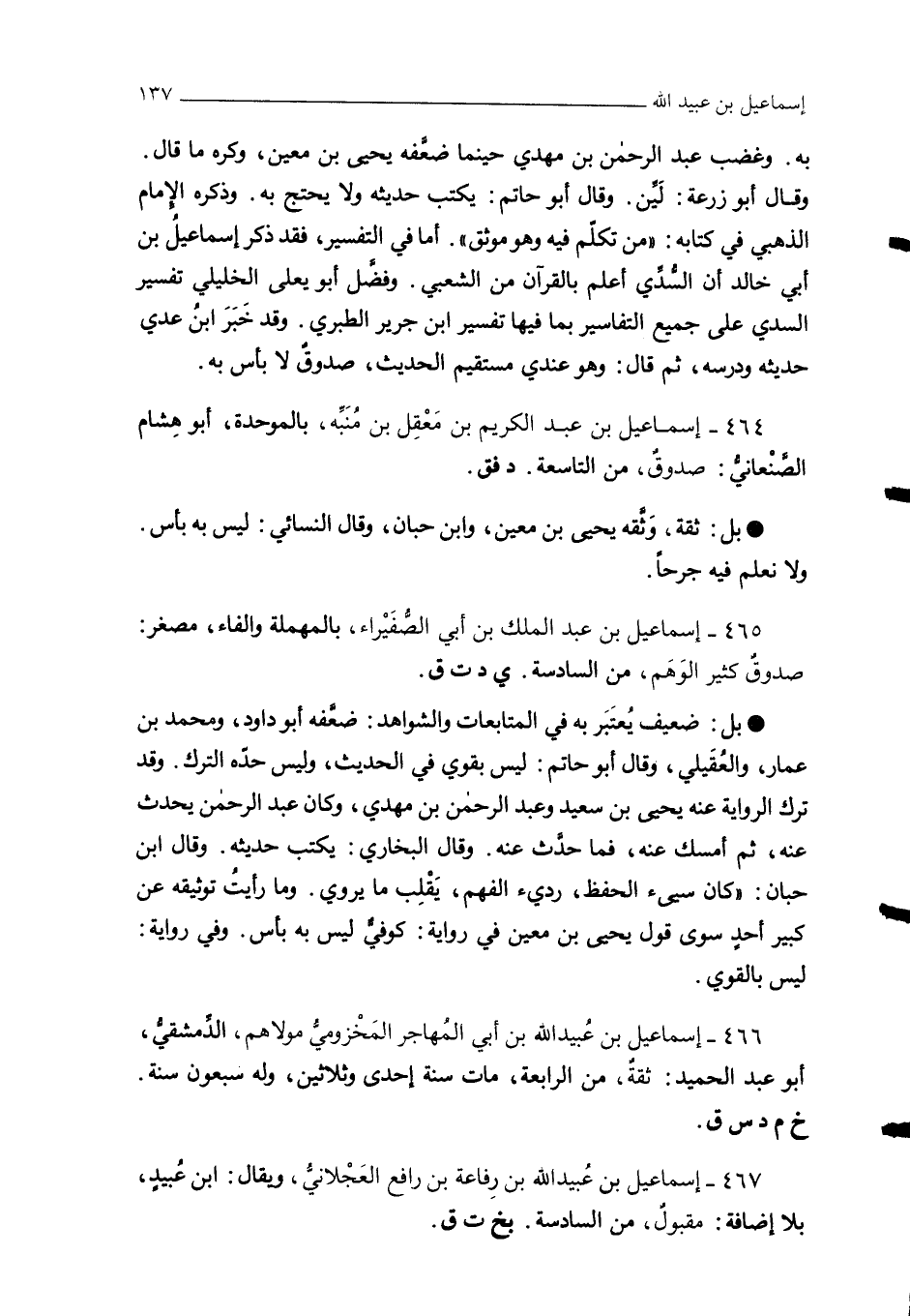 466 - إسماعيل بن عُبيد الله بن أبي المُهاجر المَخْزوميُّ مولاهم، الدِّمشقيُّ، أبو عبد الحميد: ثقةٌ، من الرابعة، مات سنة إحدى وثلاثين، وله سبعون سنة. خ م د س ق.