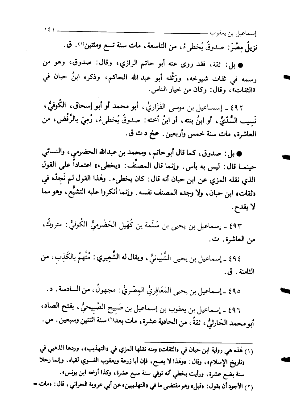 493 - إسماعيل بن يحيى بن سَلَمة بن كُهَيل الحَضْرميُّ الكُوفيُّ: متروكٌ، من العاشرة. ت.