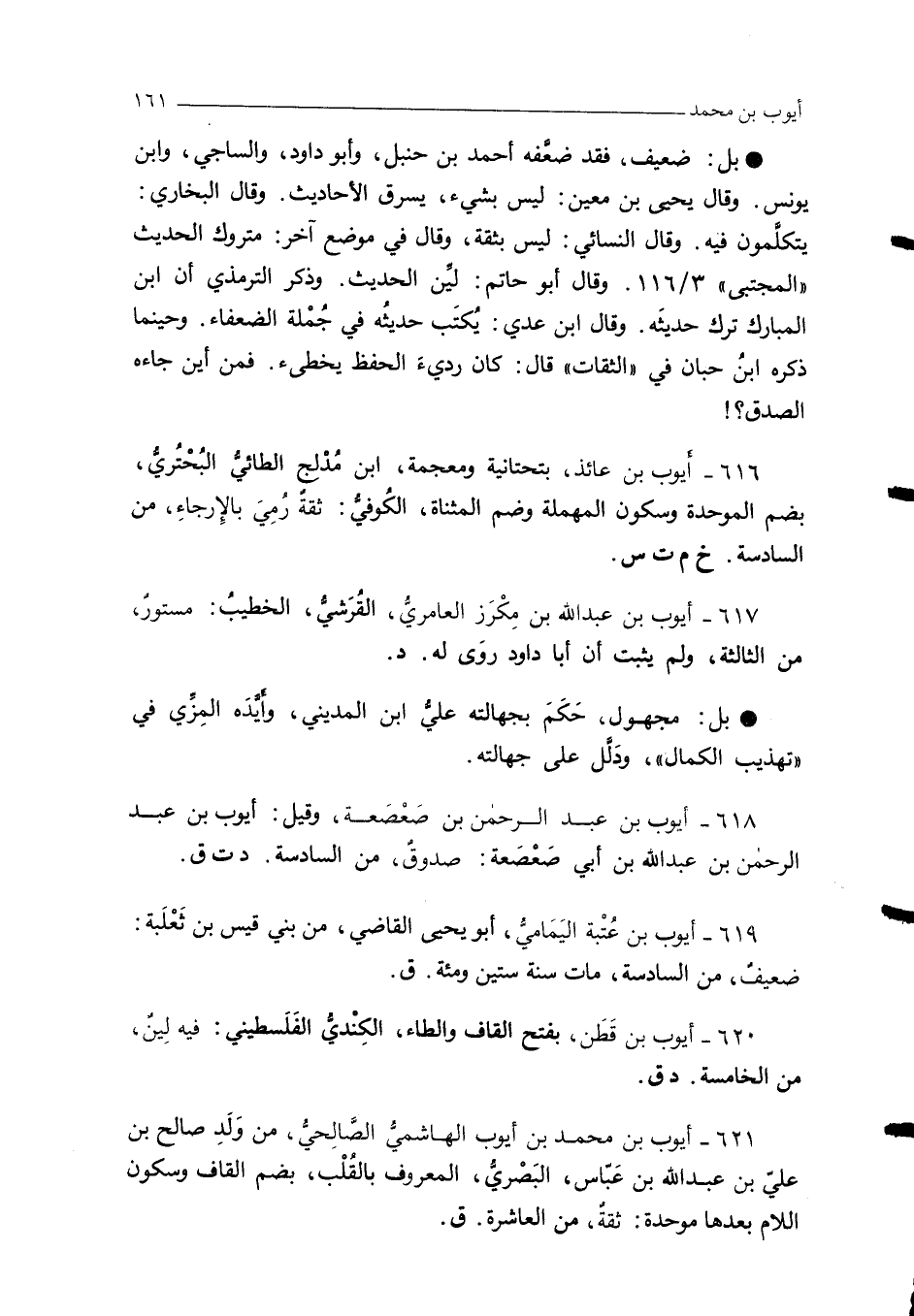 616 - أيوب بن عائذ، بتحتانية ومعجمة، ابن مُدْلج الطائيُّ البُحْتُريُّ، بضم الموحدة وسكون المهملة وضم المثناة، الكُوفيُّ: ثقةٌ رُمِيَ بالإِرجاءِ، من السادسة. خ م ت س.