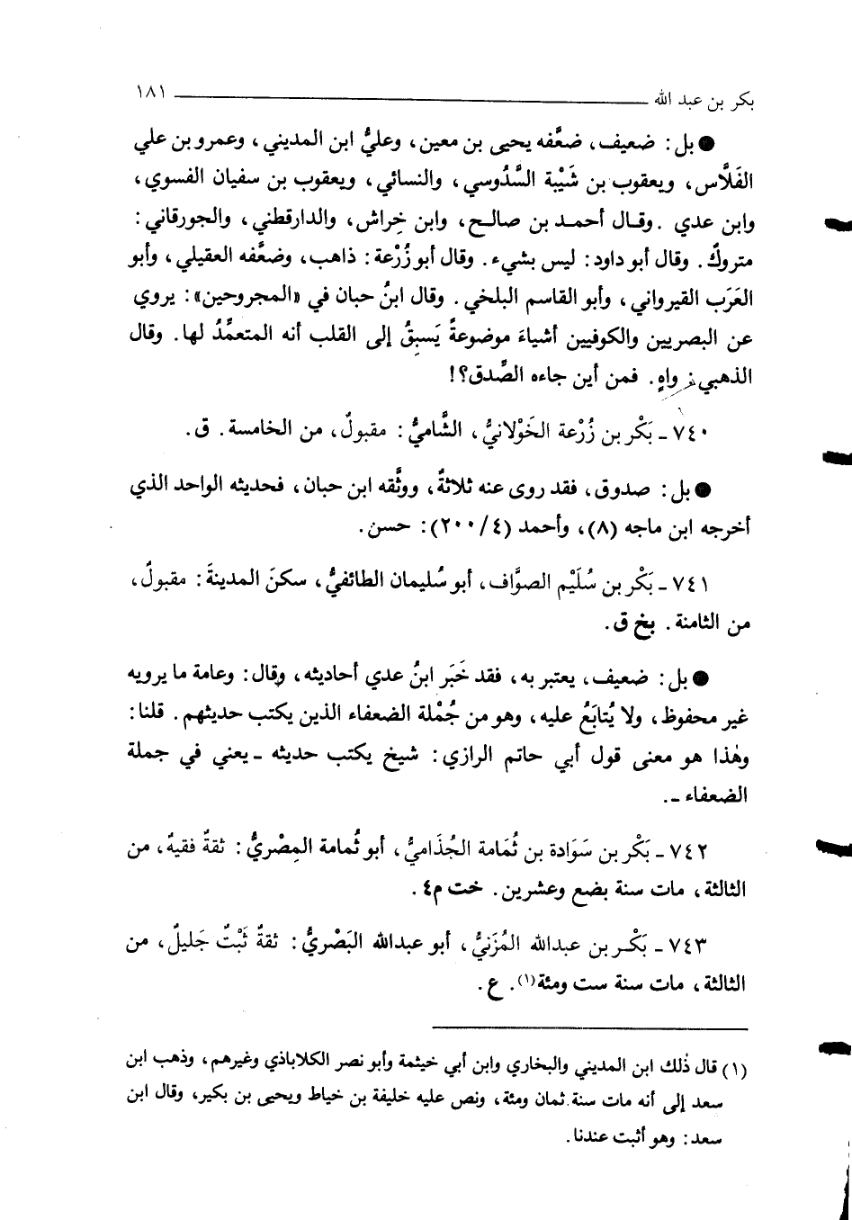 743 - بَكْر عبد الله المُزَنيُّ، أبو عبد الله البَصْريٌّ: ثقةٌ ثَبْتٌ جَليلٌ، من الثالثة، مات سنة ست ومئة (¬1). ع.