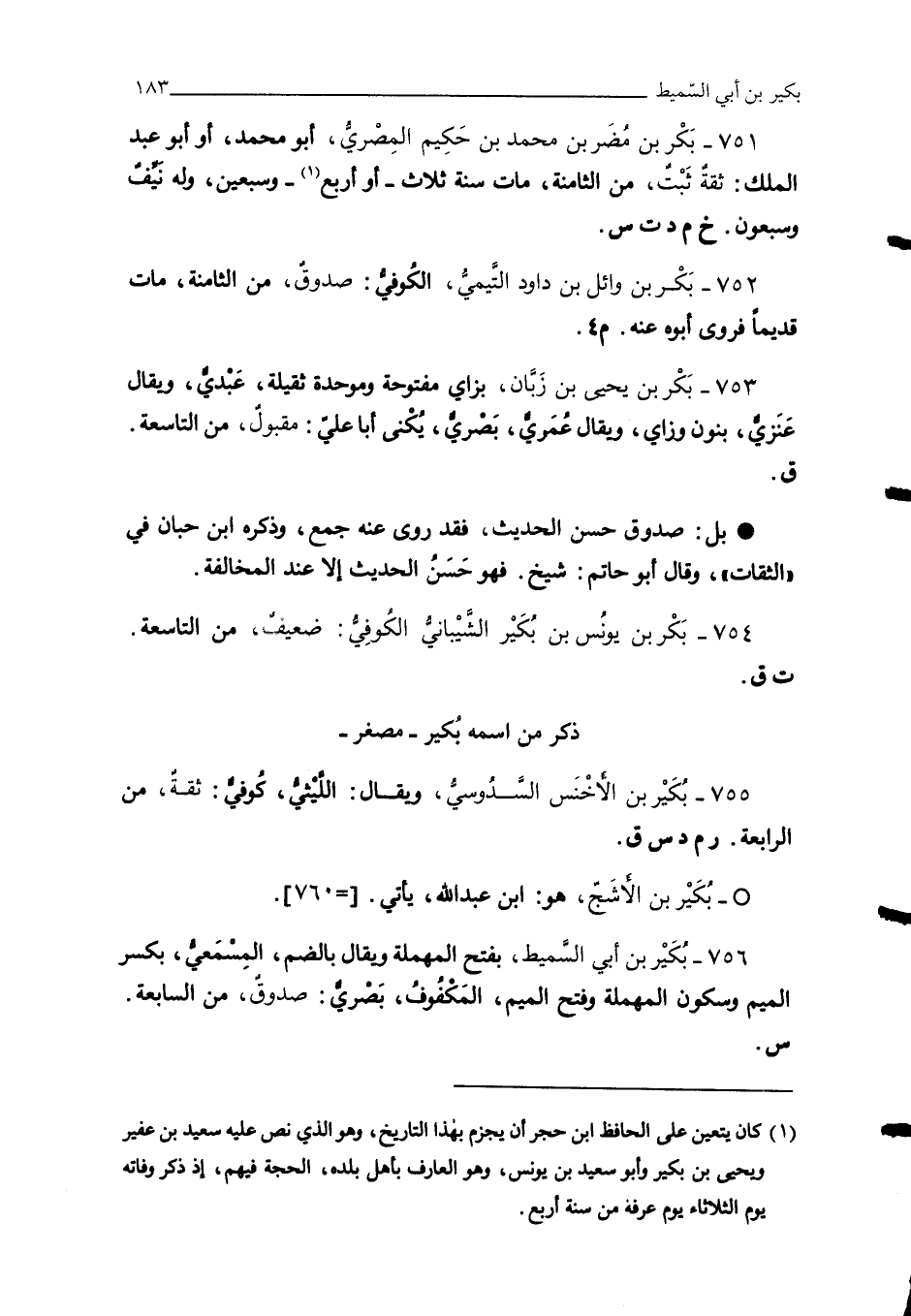 755 - بُكَيْر بن الأَخْنَس السَّدُوسيُّ، ويقال: اللَّيْثيُّ، كُوفيٌّ: ثقةٌ، من الرابعة. ر م د س ق.