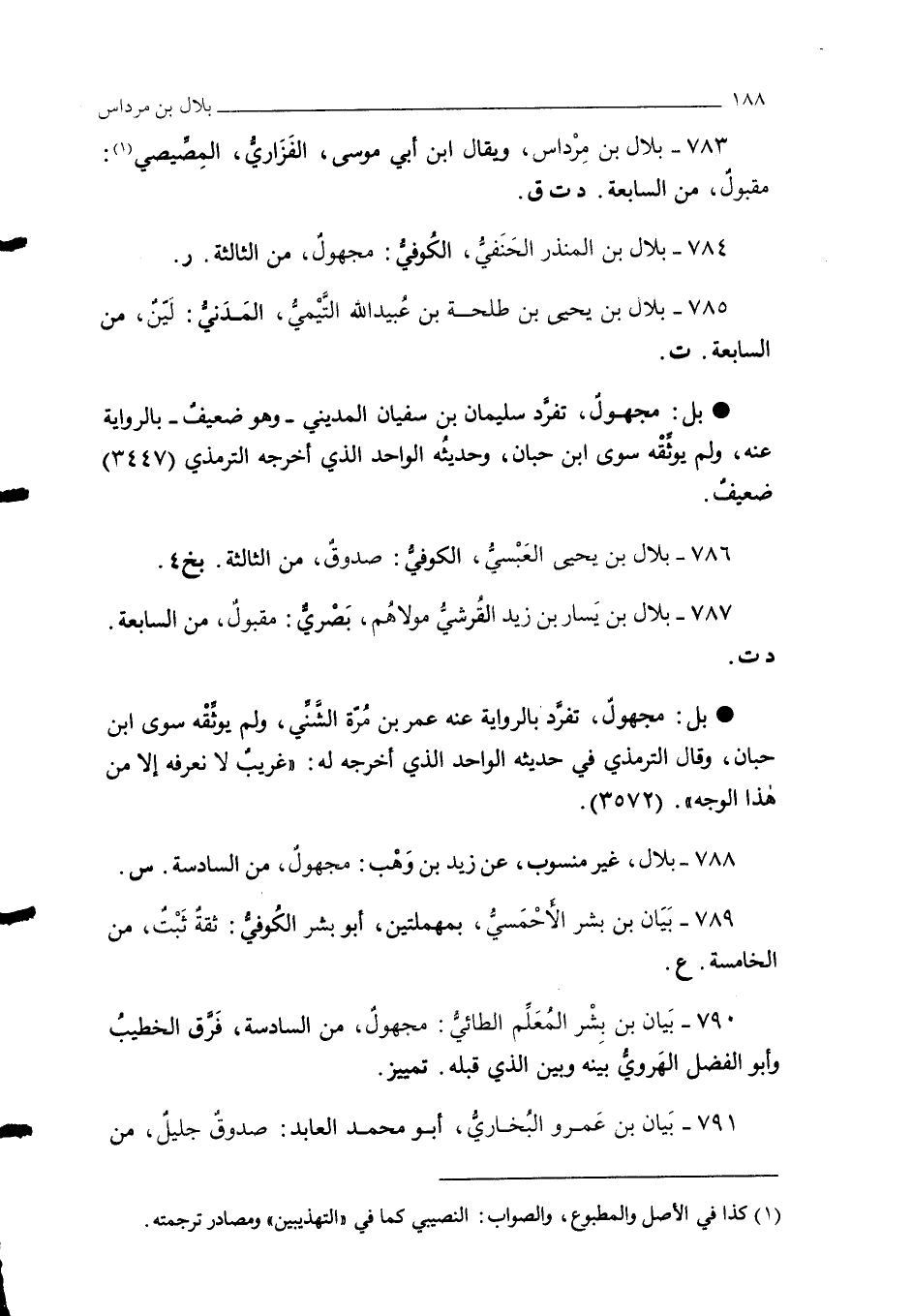 786 - بلال بن يحيى العَبْسيُّ، الكوفيُّ: صدوقٌ، من الثالثة. بخ 4.