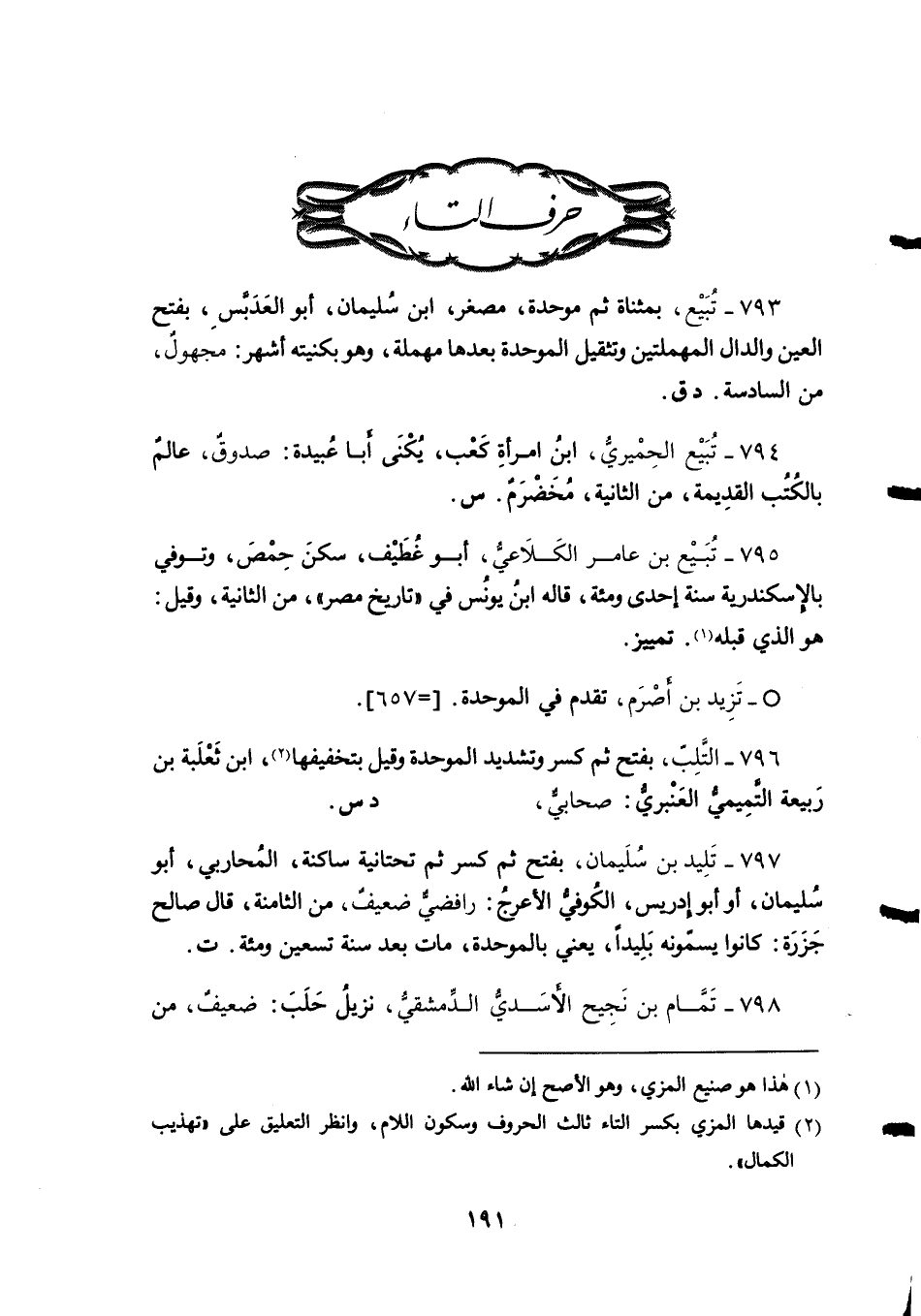 794 - تُبَيْع الحِمْيريُّ، ابنُ امرأةِ كَعْب، يُكْنَى أَبا عُبيدة: صدوقٌ، عالمٌ بالكُتُب القدِيمة، من الثانية، مُخَضْرَمُ. س.