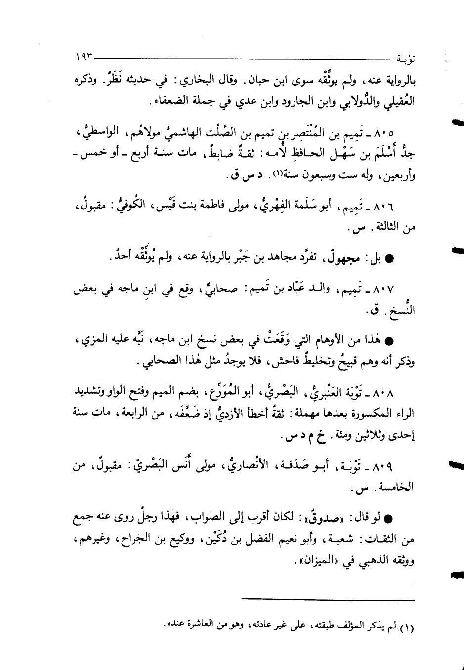 808 - تَوْبَة العَنْبريُّ، البَصْريُّ، أبو المُوَرِّع، بضم الميم وفتح الواو وتشديد الراء المكسورة بعدها مهملة: ثقةٌ أخطأ الأزديُّ إذ ضَعَّفَه، من الرابعة، مات سنة إحدى وثلاثين ومئة. خ م د س.