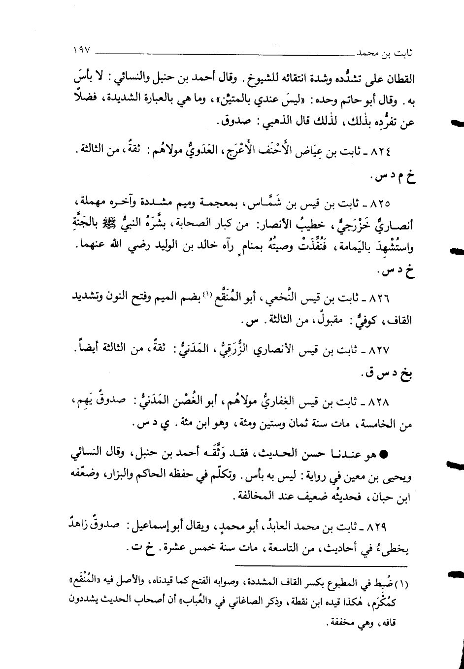 829 - ثابت بن محمد العابدُ، أبو محمدٍ، ويقال أبو إسماعيل: صدوقٌ زاهدٌ يخطئُ في أحاديث، من التاسعة، مات سنة خمس عشرة. خ ت.