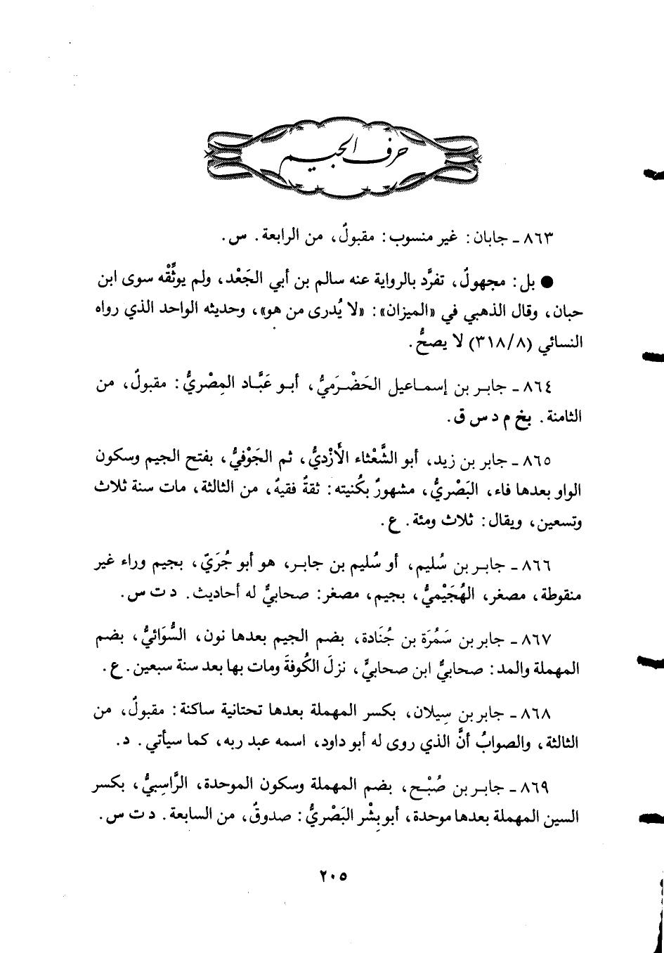 869 - جابر بن صُبْح، بضم المهملة وسكون الموحدة، الرَّاسِبيُّ، بكسر السين المهملة بعدها موحدة، أبو بِشْر البَصْريُّ: صدوقٌ، من السابعة. د ت س.